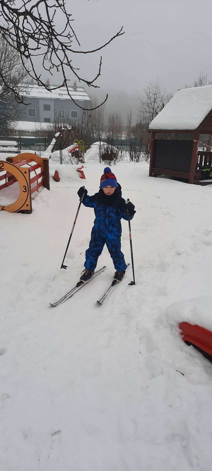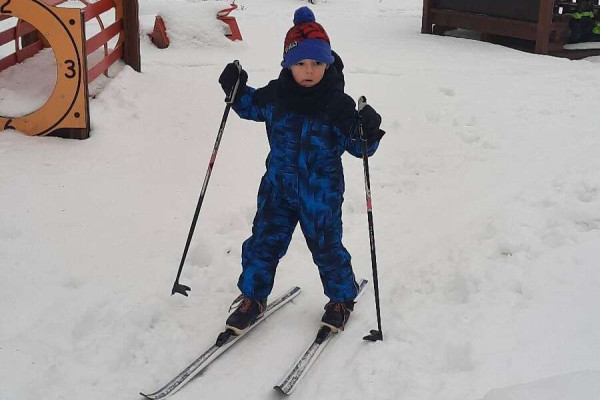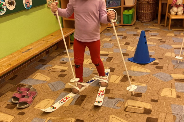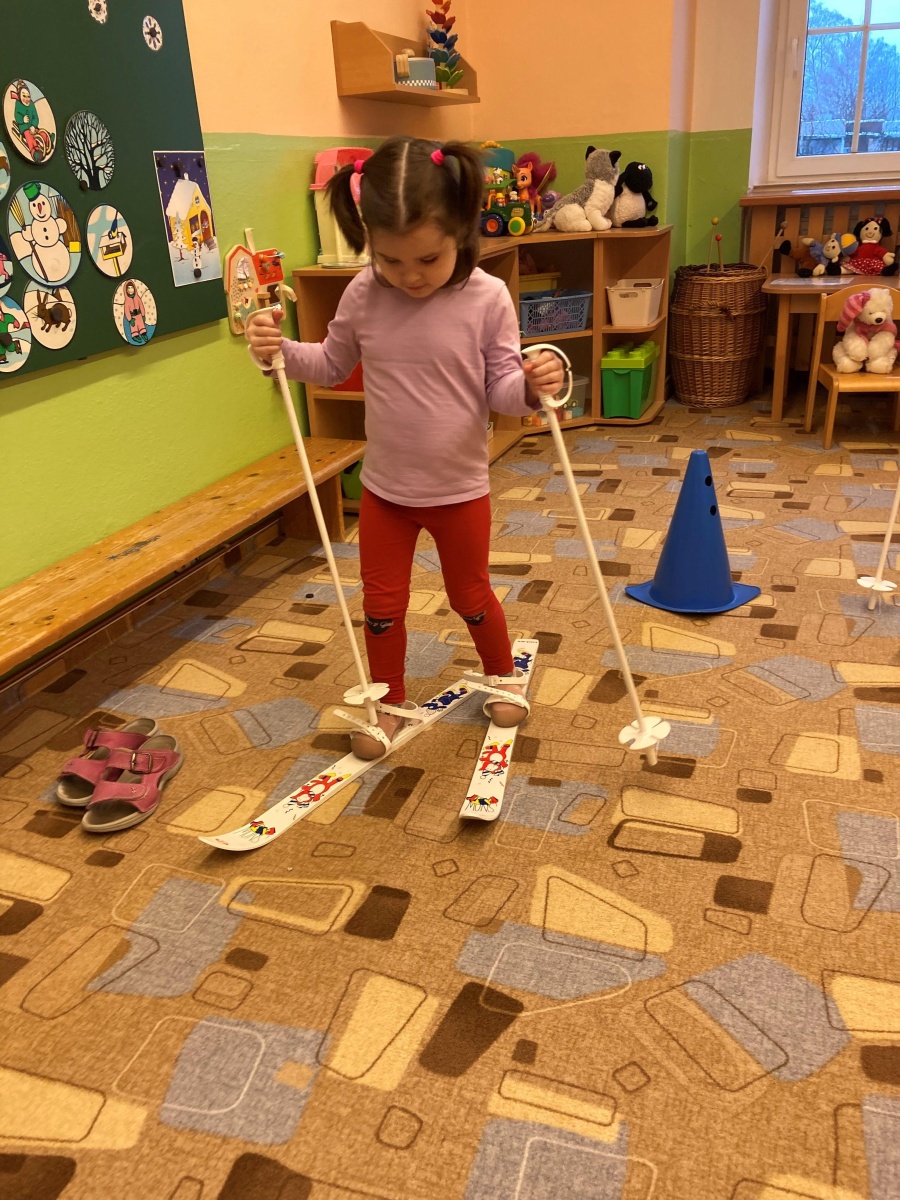 Pěkně v teple třídy jsme si také vyzkoušeli chůzi na lyžích (běžkách), a pokud budou venku ideální podmínky, možná to zkusíme i na zahradě školky. Vždyť starší kamarádi ze třídy Zajíčků i Medvídků už to zvládají.