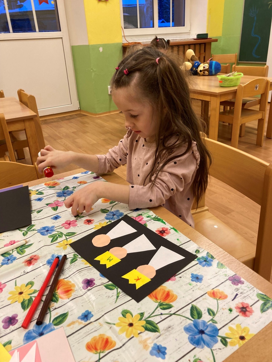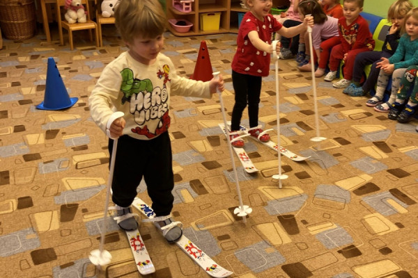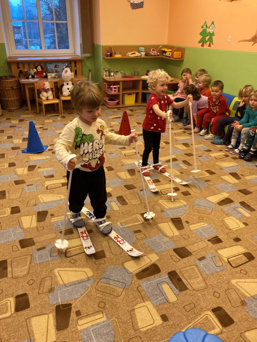 V dalším týdnu jsme se věnovali zimním sportům - sportovali jsme nejen venku (běžkování na vyjeté dráze na zahradě), ale i uvnitř (závodění v tělocvičně, bruslení, ...). Také jsme s dětmi stihli vykouzlit krásné výtvory - skupinové tvoření pomocí inkoustu a zmizíků a individuální tvoření pomocí nabarveného provázku.