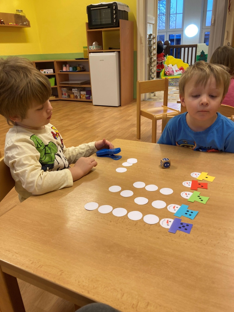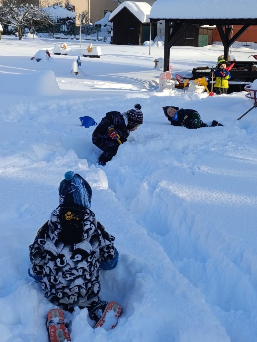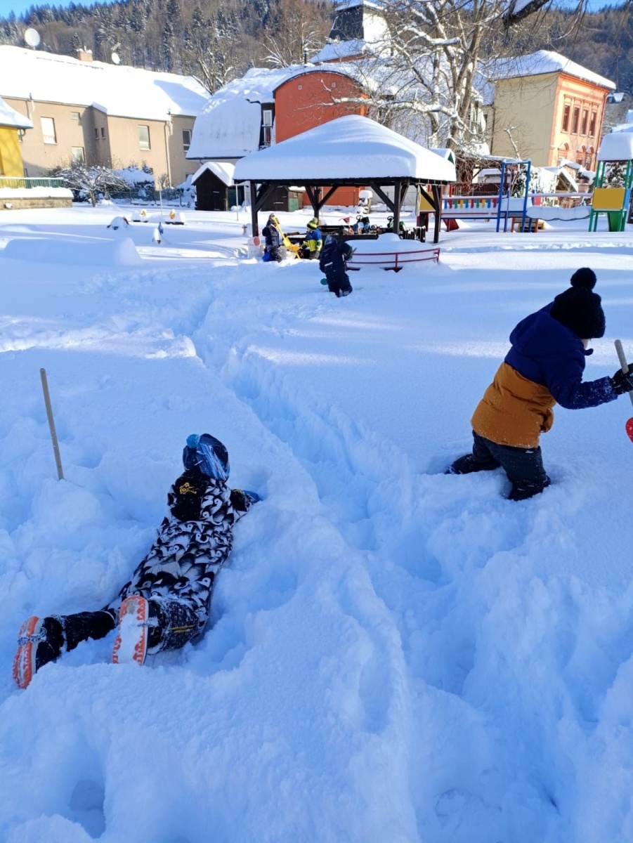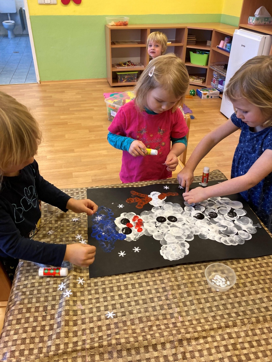 A hlavně nám napadl sníh – to bylo radosti, když jsme místo vycházek mohli chodit na zahradu a užívat si radovánek. Stavění ze sněhu, vyšlapávání cestiček a také jsme děti naučili správná pravidla jízdy na kopci, aby to pro všechny bylo bezpečné. O sněhu jsme si povídali i ve školce – dělali jsme s ním různé pokusy, sledovali jeho změny, tiskali jsme barvy, abychom do šatničky měli nové obrázky pro rodiče. Sněhuláky jsme ve školce stavěli z bílých plastových víček, ale i z plošných dílů – u toho jsme si vyzkoušeli paměť, když se na sněhulákovi něco změnilo a děti to měly poznat, procvičili jsme uvolnění ruky při krouživém pohybu – kreslení sněhových koulí křídou na tabuli a také motoriku prstů při nalepování drobných papírových vloček. Děti jsme se seznámili s tzv. mluvícím kolíčkem – paní učitelka namluví zadání úkolu a ukáže dětem, kde si zmáčknou, poslechnou si a podle toho pokračují – např. hledání obrázků se sněhulákem s barevnou šálou a stejným barevným kolečkem nebo přiřazování kolečka podle hodu kostkou (od 1-5). Se zimou souvisí i oblékání – pojmenování částí oblečení, třídění, druhy rukaviček, a s tím souviselo i tvoření – kolektivní práce s barevným krepovým papírem a vytvoření dvou krásných palčákových rukaviček. Naučili jsme se také nové říkanky a písničky.