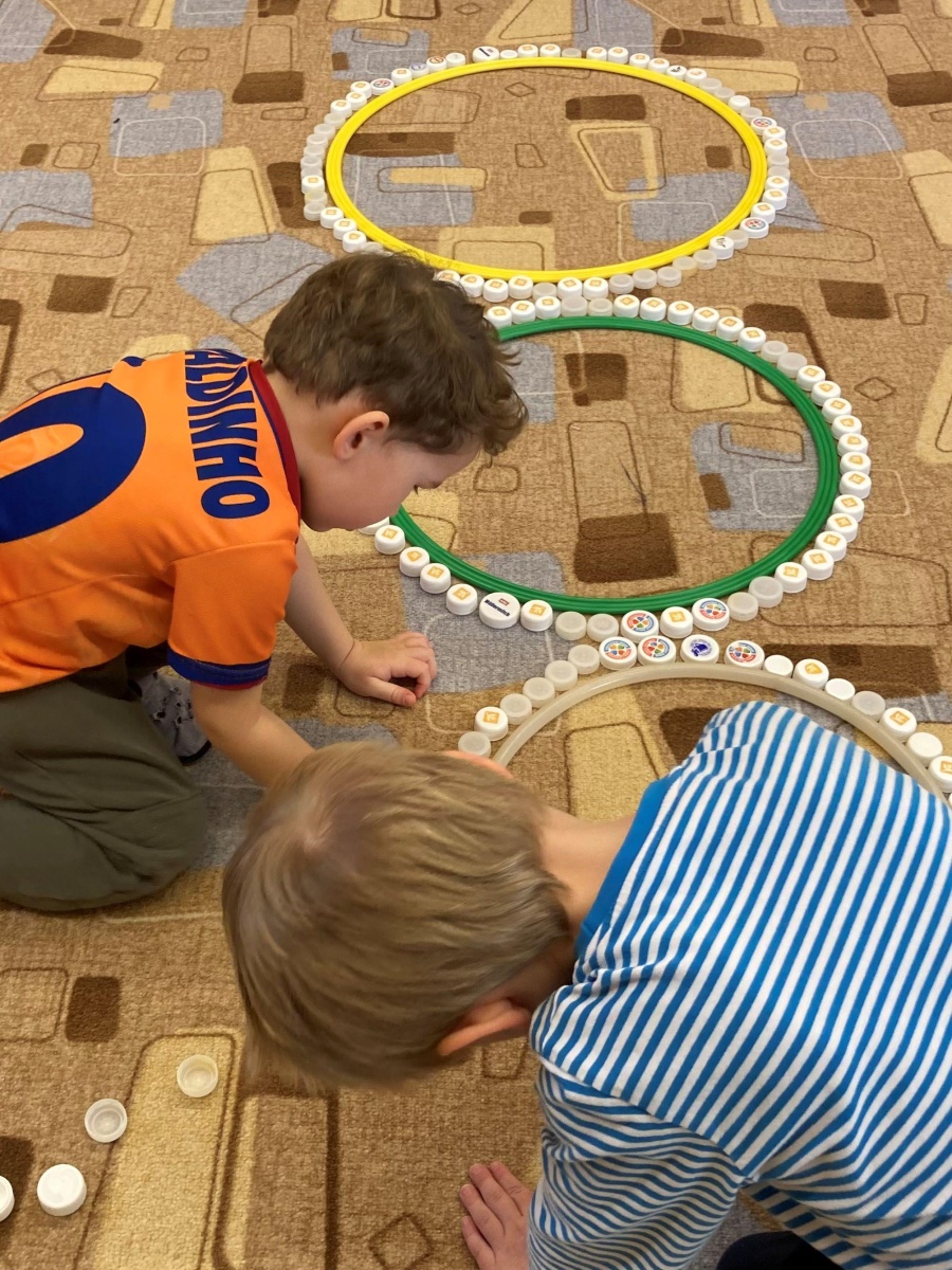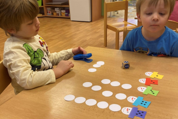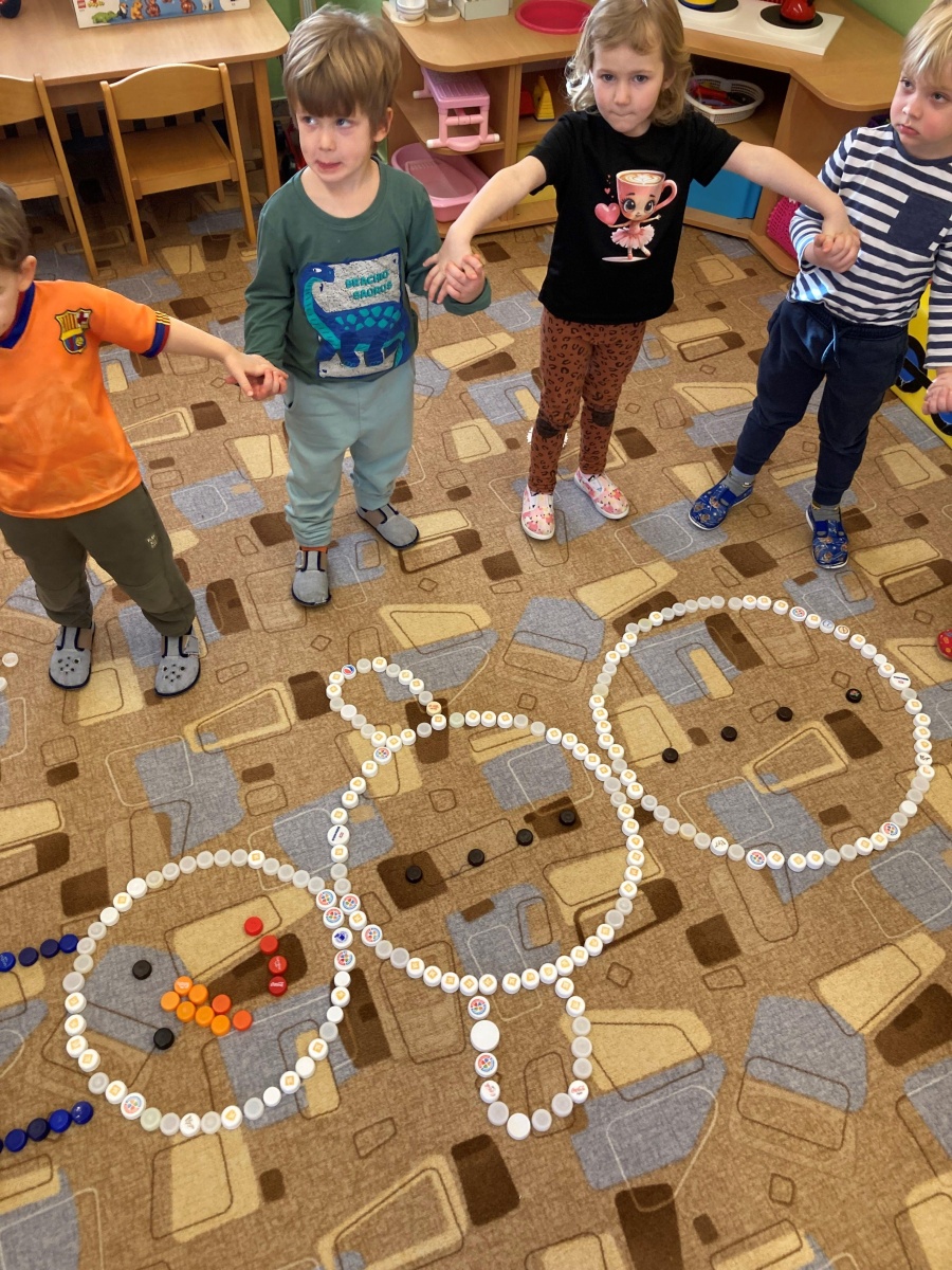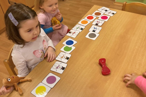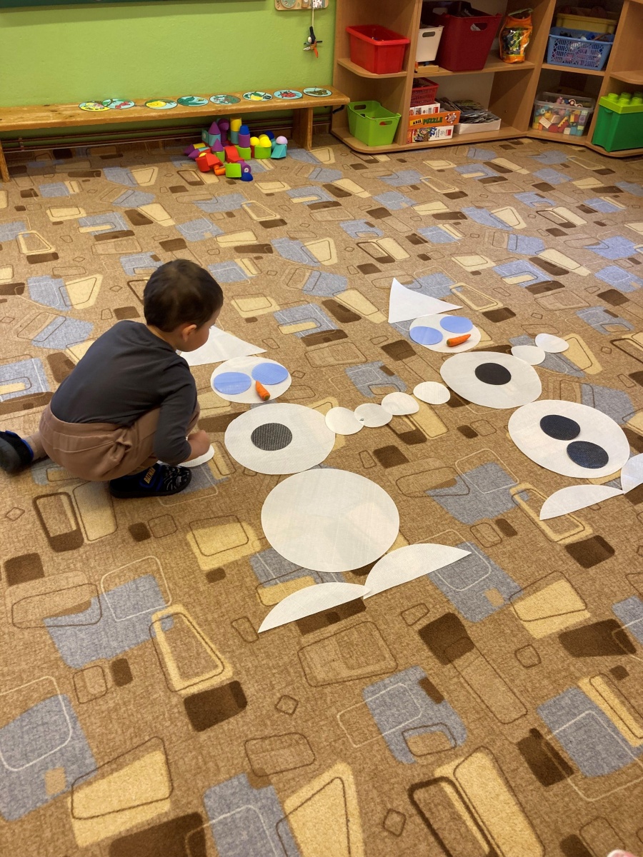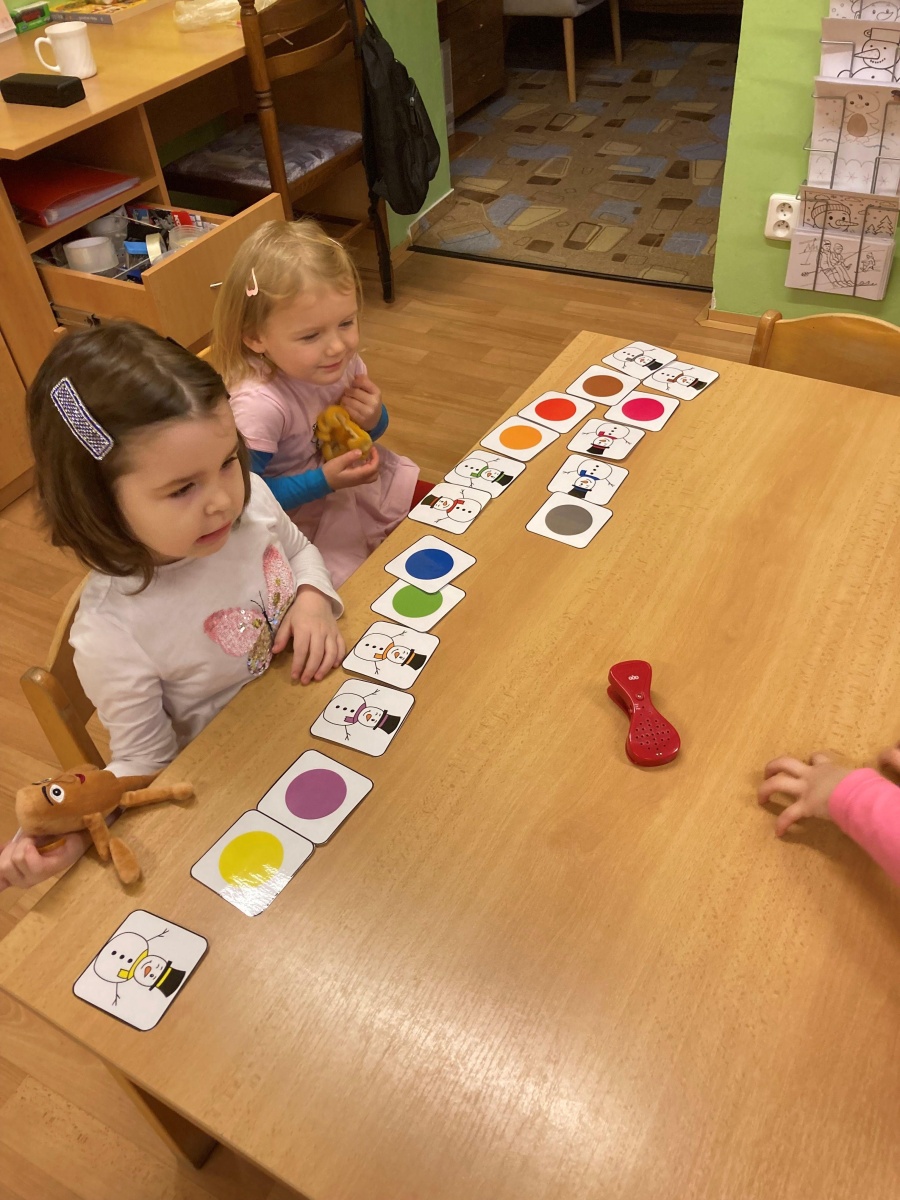 A hlavně nám napadl sníh – to bylo radosti, když jsme místo vycházek mohli chodit na zahradu a užívat si radovánek. Stavění ze sněhu, vyšlapávání cestiček a také jsme děti naučili správná pravidla jízdy na kopci, aby to pro všechny bylo bezpečné. O sněhu jsme si povídali i ve školce – dělali jsme s ním různé pokusy, sledovali jeho změny, tiskali jsme barvy, abychom do šatničky měli nové obrázky pro rodiče. Sněhuláky jsme ve školce stavěli z bílých plastových víček, ale i z plošných dílů – u toho jsme si vyzkoušeli paměť, když se na sněhulákovi něco změnilo a děti to měly poznat, procvičili jsme uvolnění ruky při krouživém pohybu – kreslení sněhových koulí křídou na tabuli a také motoriku prstů při nalepování drobných papírových vloček. Děti jsme se seznámili s tzv. mluvícím kolíčkem – paní učitelka namluví zadání úkolu a ukáže dětem, kde si zmáčknou, poslechnou si a podle toho pokračují – např. hledání obrázků se sněhulákem s barevnou šálou a stejným barevným kolečkem nebo přiřazování kolečka podle hodu kostkou (od 1-5). Se zimou souvisí i oblékání – pojmenování částí oblečení, třídění, druhy rukaviček, a s tím souviselo i tvoření – kolektivní práce s barevným krepovým papírem a vytvoření dvou krásných palčákových rukaviček. Naučili jsme se také nové říkanky a písničky.