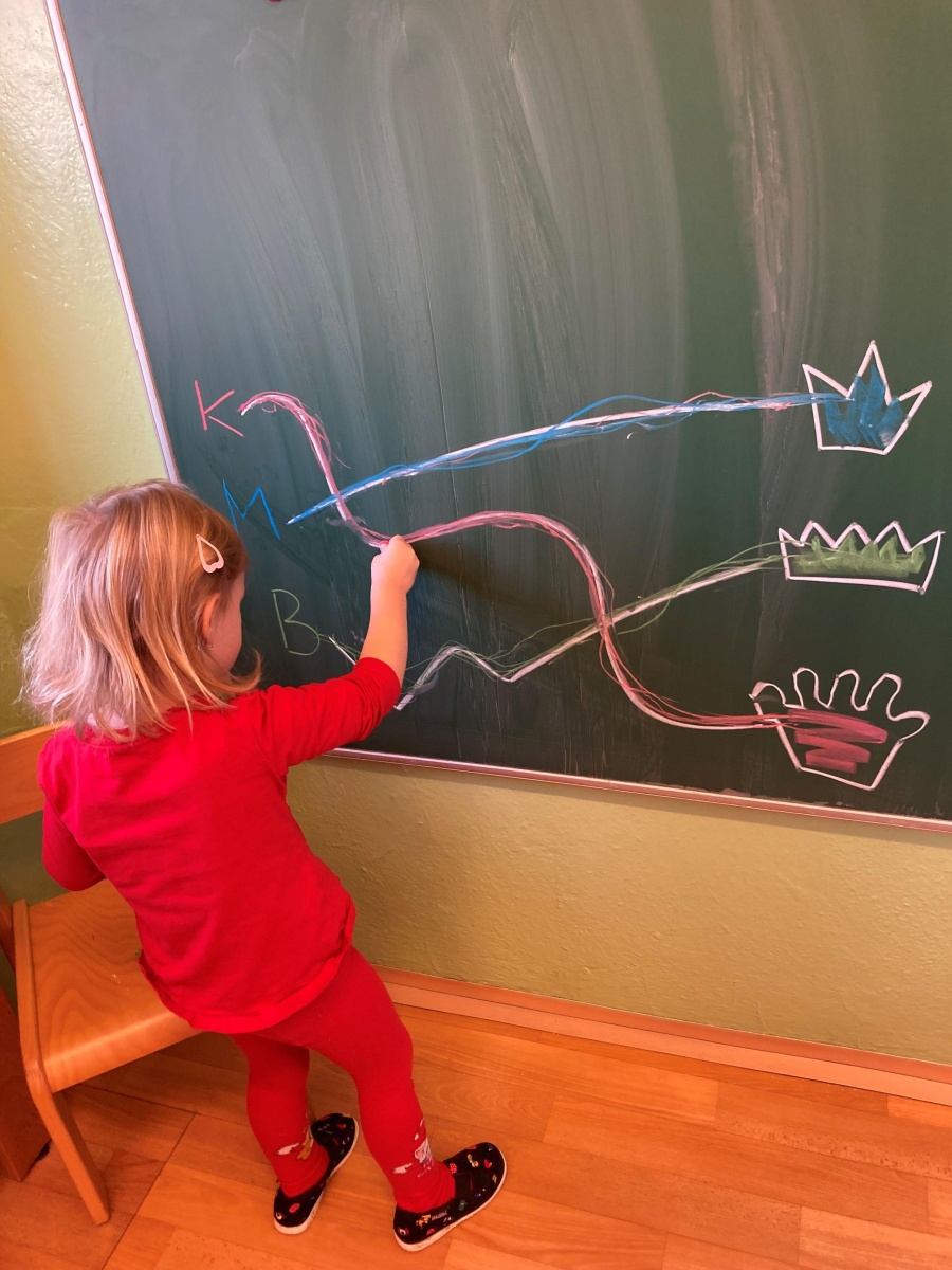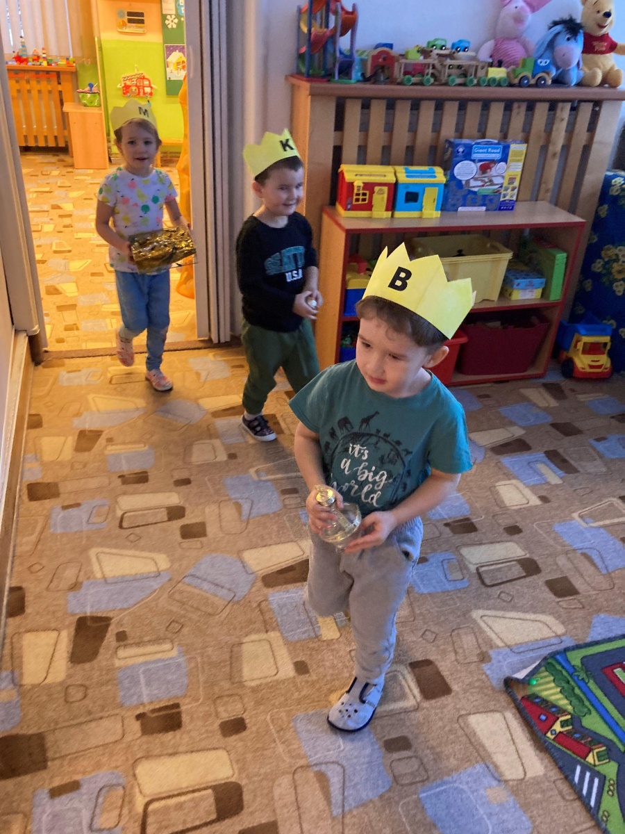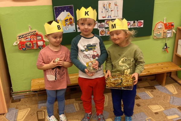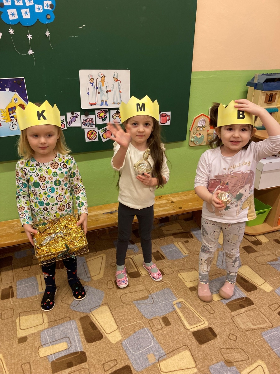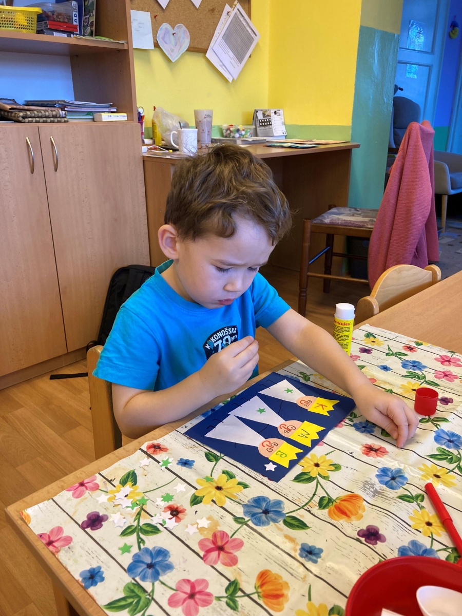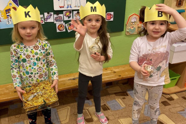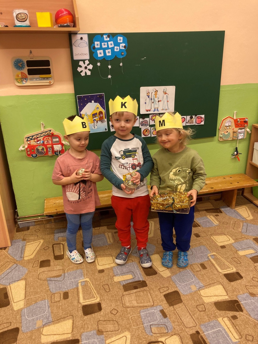 Společně jsme si povídali o tradici Tří králů – pověděli jsme si jejich jména, podívali se v TV na krátký příběh a těšili jsme se, že nás ve školce navštíví. Měli jsme pro ně připravené drobné korunky, a když děti ze ZŠ opravdu přišly, poslechli jsme si, jak celou písničku umí zazpívat, my ve školce jen kousek. Na Tři krále jsme si také zahráli, sledovali jsme jejich cestu na papíře, zkoušeli ji kreslit na tabuli křídou. Při procházkách jsme sledovali na dveřích domů, u koho se zastavili.
