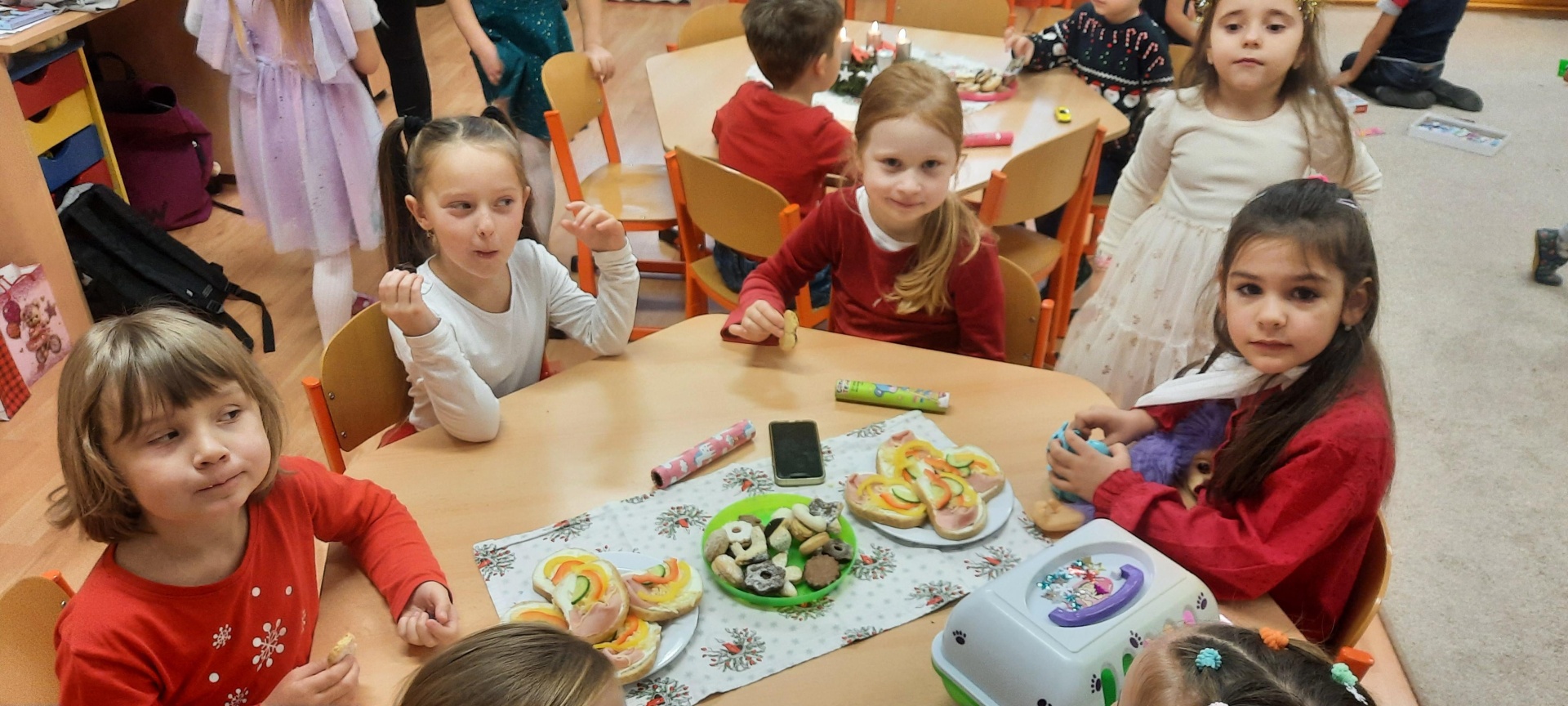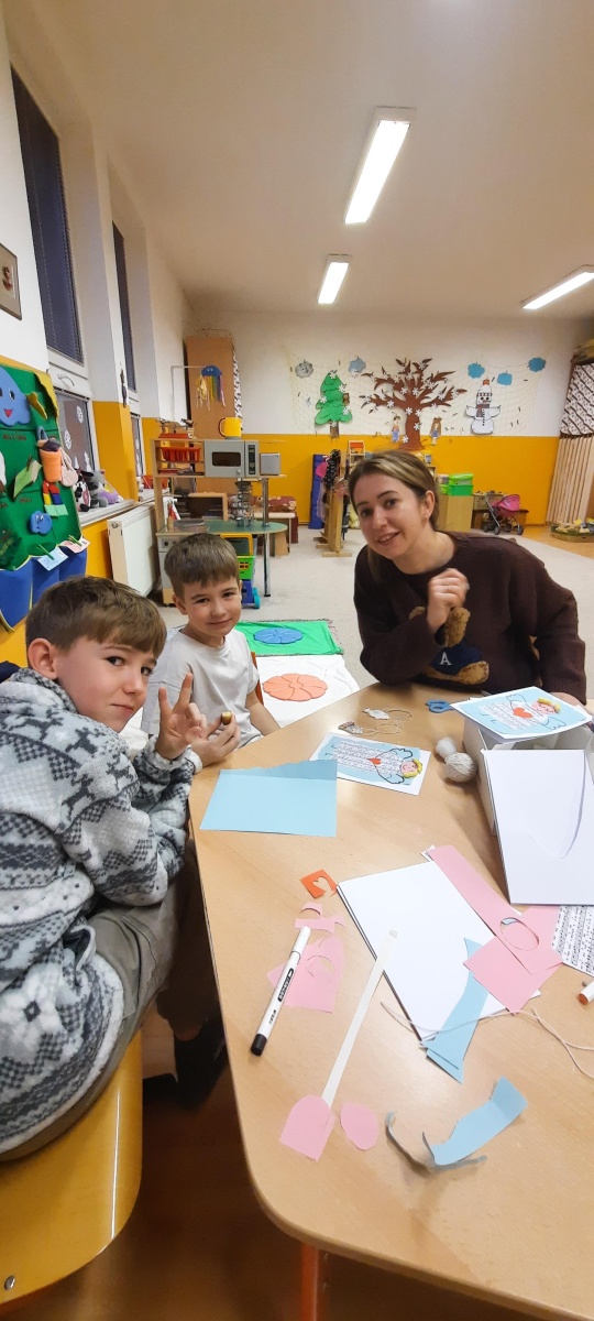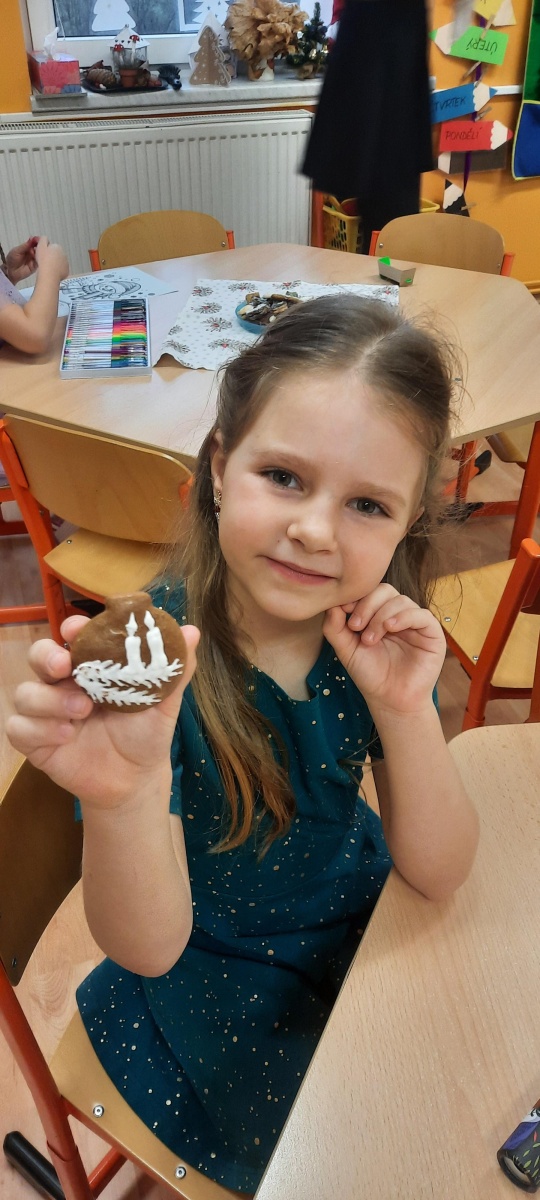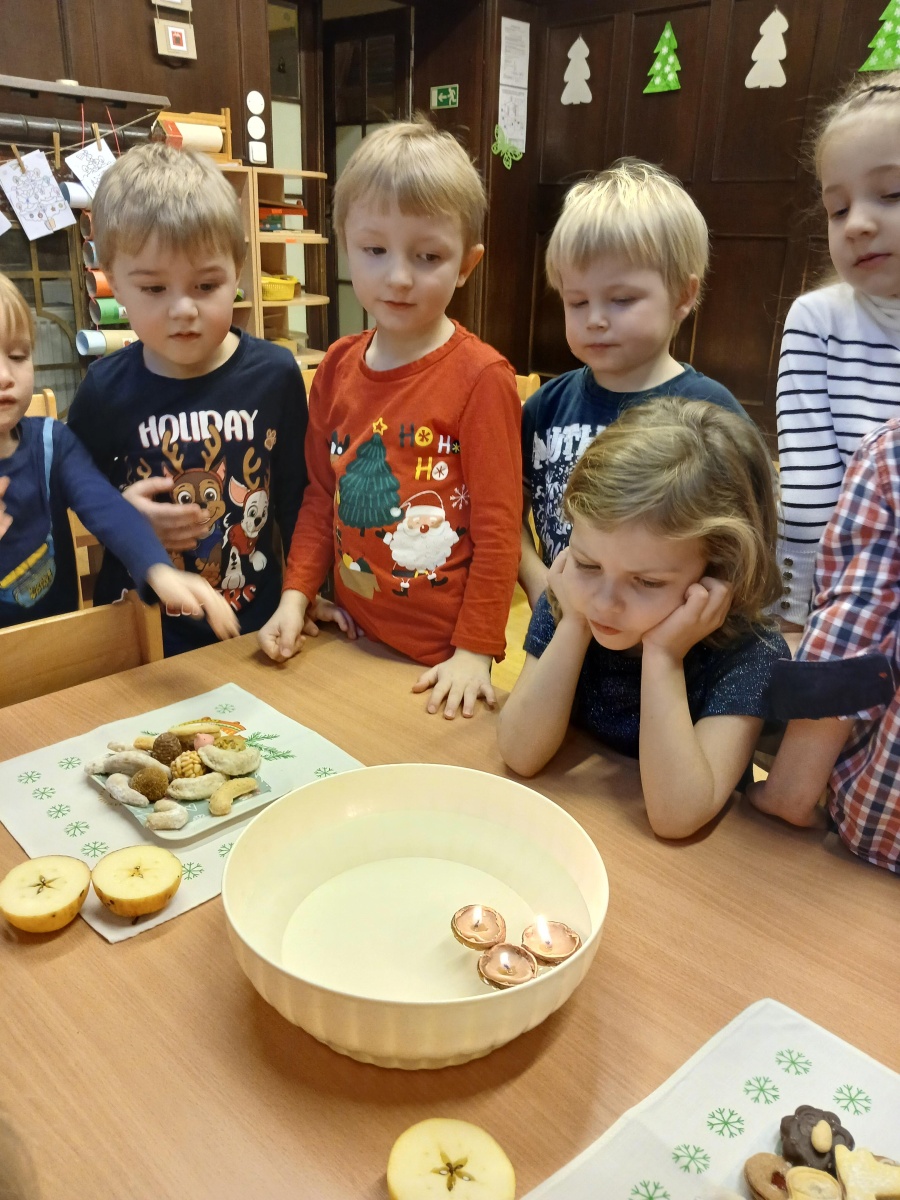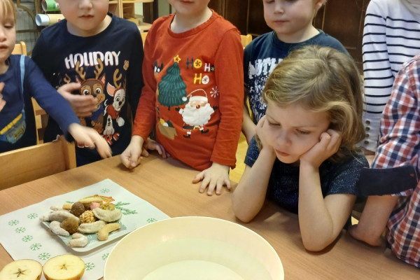 V posledním týdnu jsme stihli vyrobit přáníčka a pak již přišel dlouho očekávaný vánoční den. Děti si donesly napečené cukroví, které jsme po slavnostní svačince všichni rádi ochutnali, rozkrojili jsme si jablíčko, kde se nám ukázala hvězdička pro štěstí, pustili jsme si na vodě lodičky ze skořápek ořechů, zapálili si prskavky a zazpívali si u stromečku koledu. Když zazvonil Ježíšek, všichni jsme si s radostí rozbalili nové hračky.