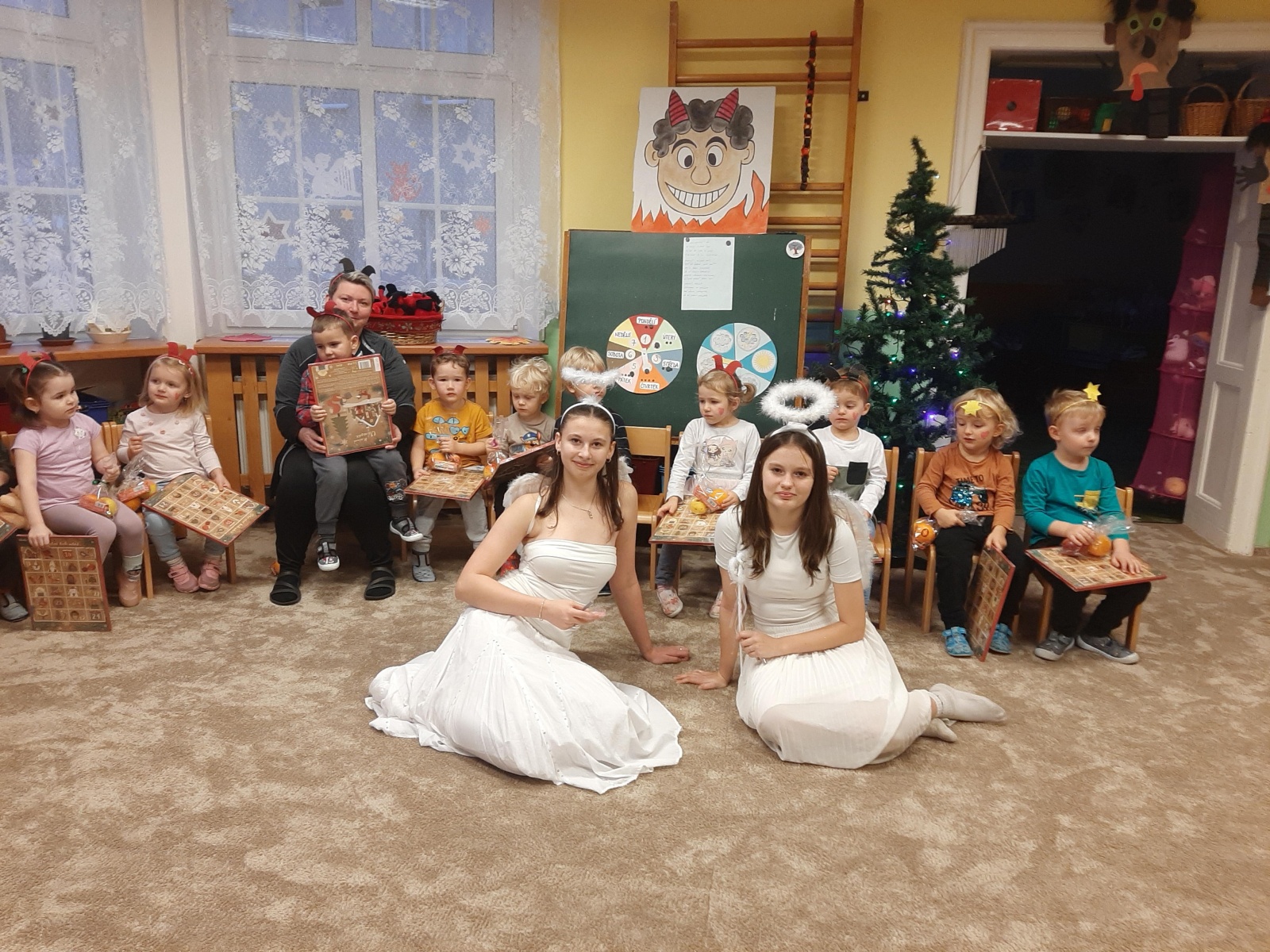 První týden jsme měli přímo čertovský, čerty jsme si malovali, lepili a stříhali, s plyšovými čertíky jsme si hráli, cvičili a zpívali. Nakonec k nám čertíci i zavítali, spolu s andílky a Mikulášem. Děti byly statečné, všichni společně jsme zarecitovali připravenou básničku a odměnou nám byla sladká nadílka.