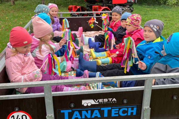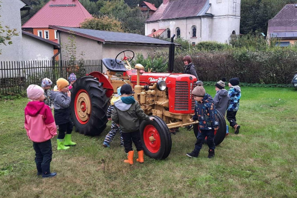 V druhém týdnu jsme se přehoupli zprvu na pole a děti měly možnost zblízka si prohlédnout traktory, a dokonce se i svézt. Dále jsme se zaměřili na přírodu, jak se s příchodem podzimu proměňuje (zbarvení a padání listů).