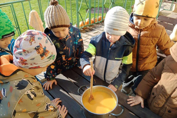 Na závěr měsíce, ještě před podzimními prázdninami, jsme si užili týden strašidel, duchů a dýní, zakončený divokým rejem v maskách. S tím souvisela i společná akce MŠ - Dýňová slavnost na školní zahradě, dlabání a zdobení dýní a vaření dýňové polévky. Všechny dýně byly odvezeny na Stezku korunami stromů, kam jsme za odměnu dostali pozvání a ihned první den podzimních prázdnin ji navštívili.
