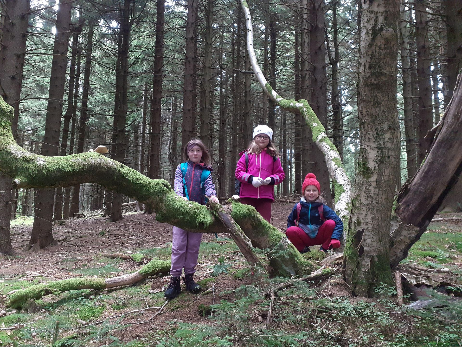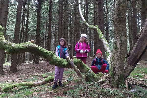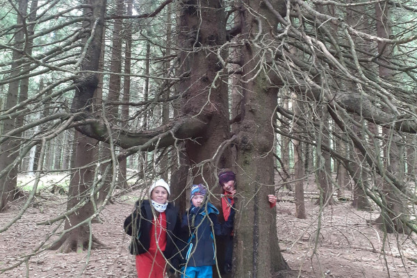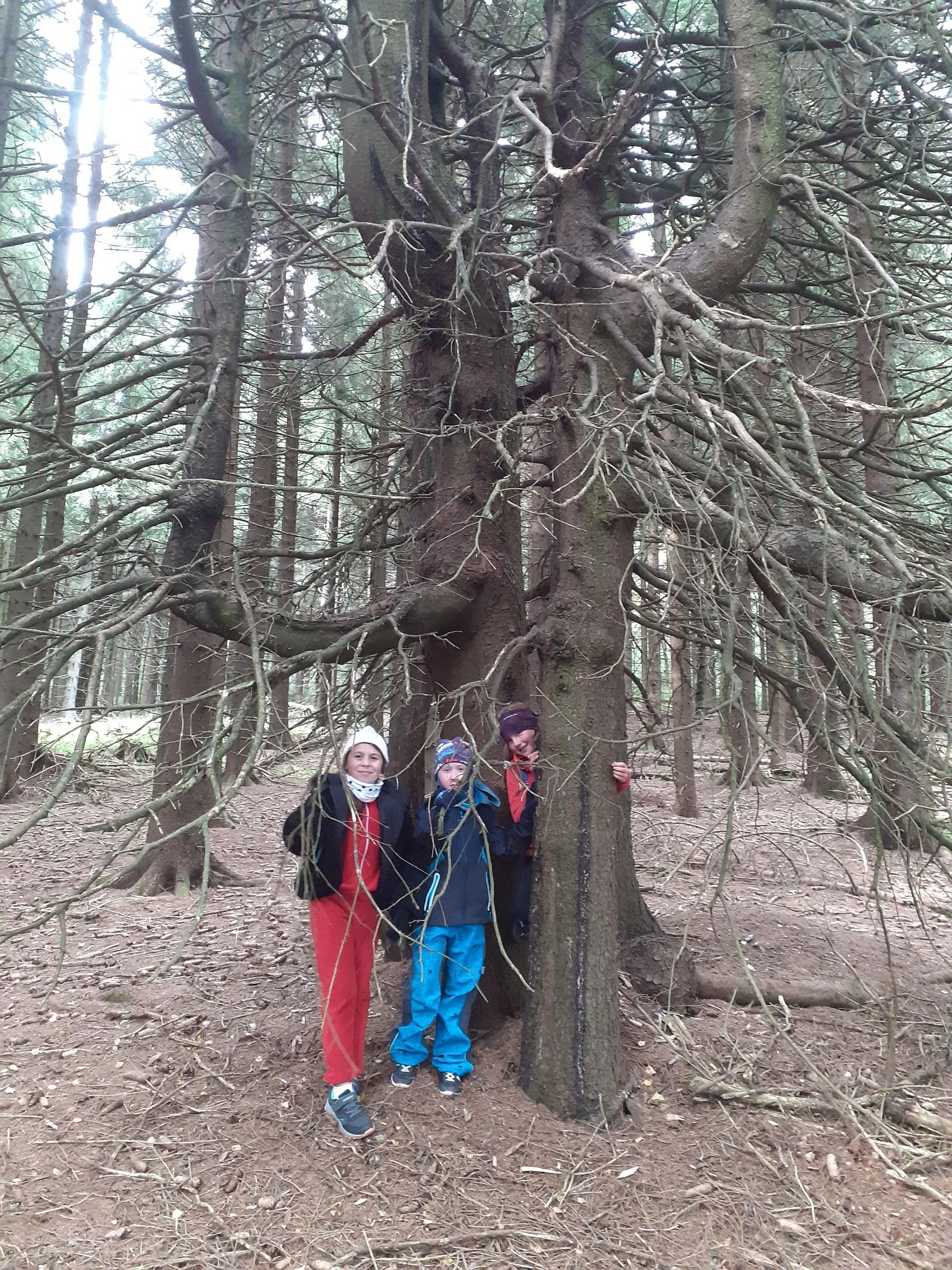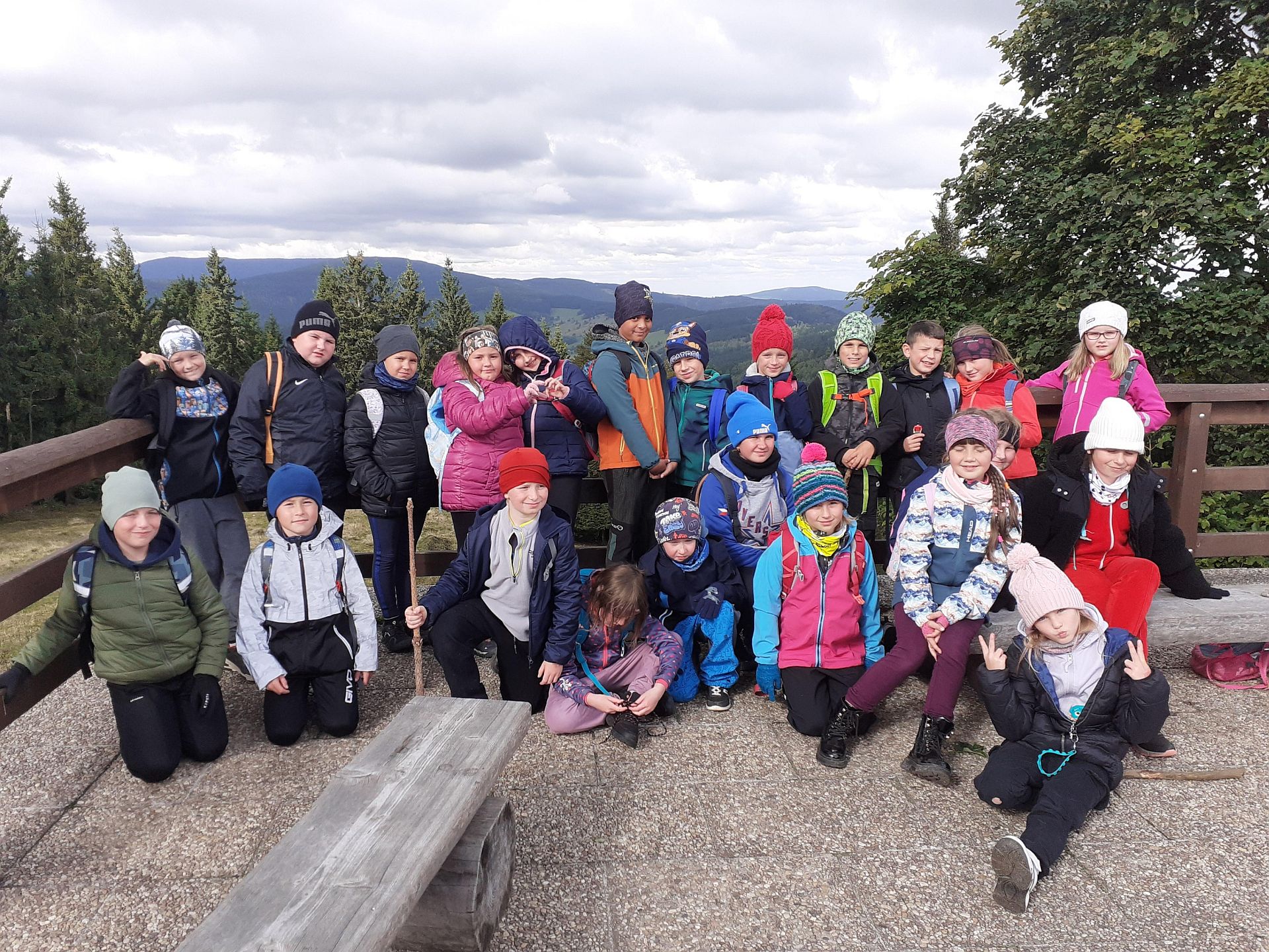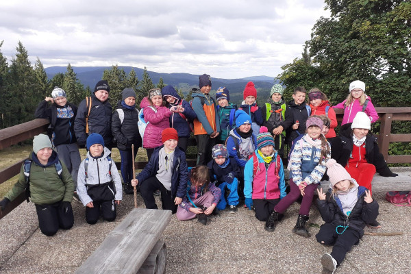 Třeťáci za sucha dorazili do cíle své cesty - na Rýchorskou boudu. Cestou stihli poznávat houby, učit se mapové značky, procvičit si násobilky a hlavně nenechat se sfouknout z Rýchor. Po výborném obědě a poledním klidu vyrazili znovu do pořádného vichru, který je odvál nejdříve na vyhlídku a pak do lesa k Rýchorskému kříži, kde postavili spoustu zajímavých staveb.