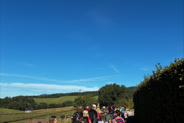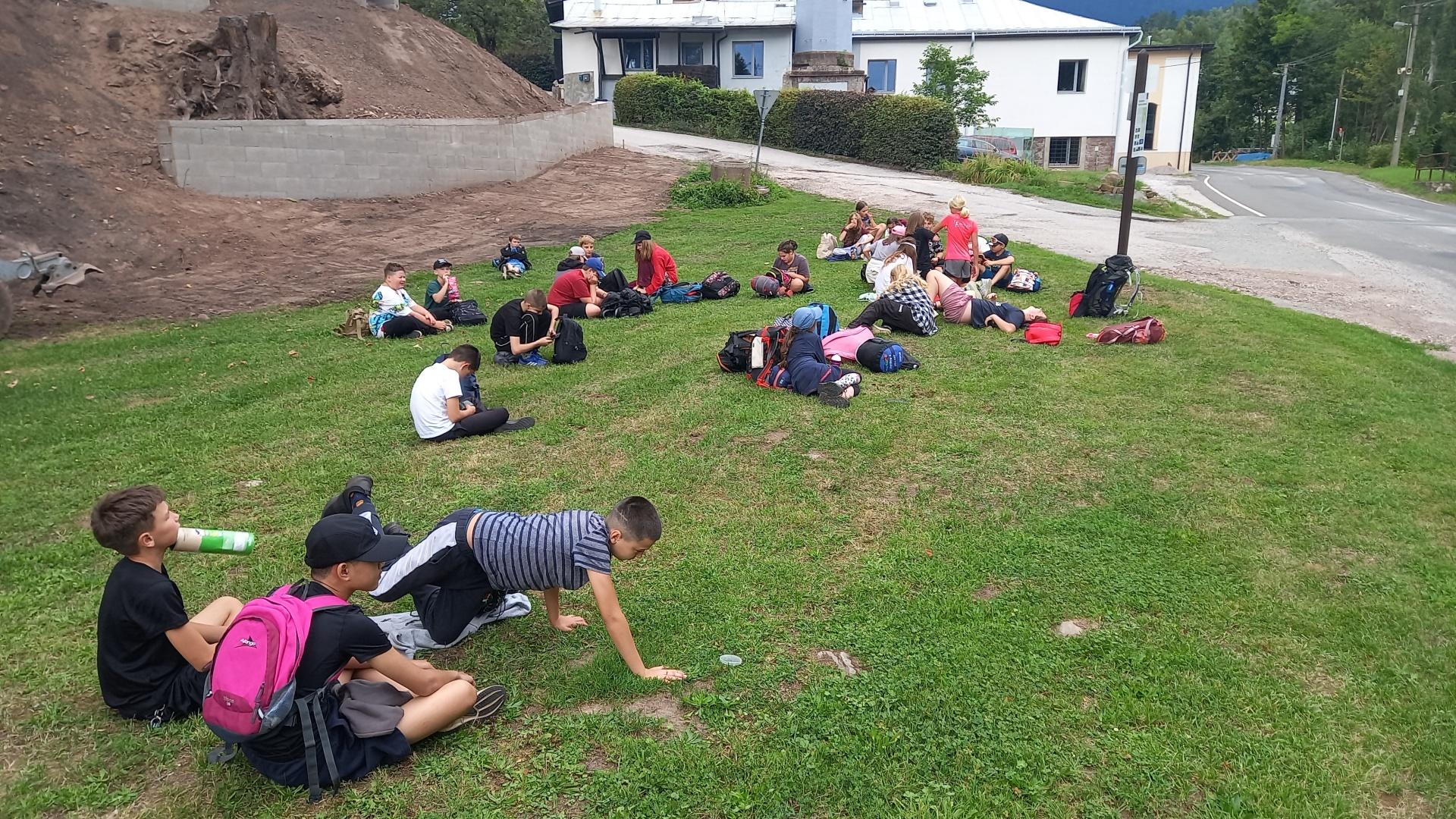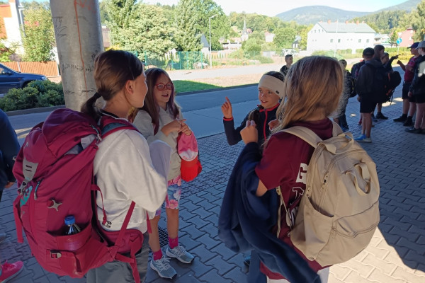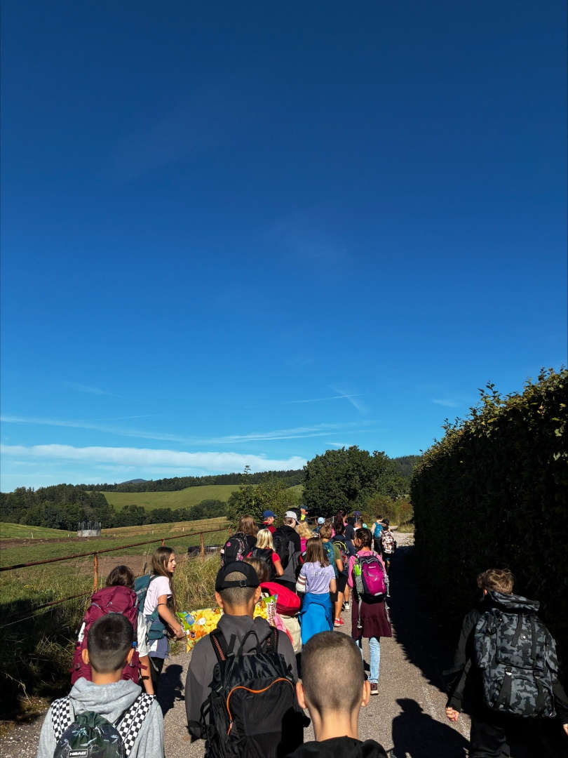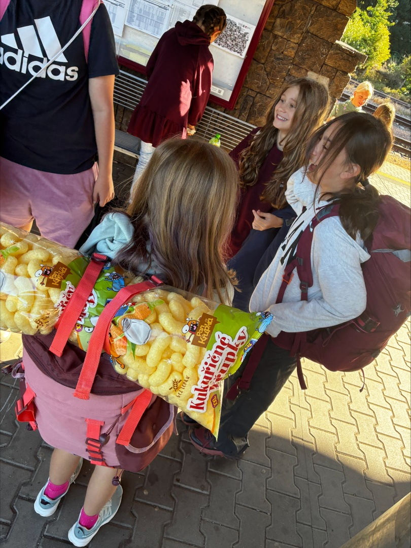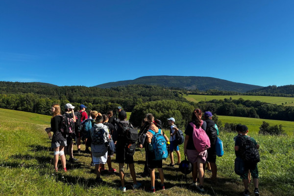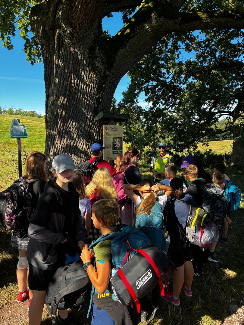 Tři dny ve škole, dva v přírodě, tak měl v novém školním roce vypadat první týden čerstvých šesťáků. I stalo se, původní plán vyšel, ve čtvrtek jsme vyrazili. A bylo nás… hodně. Zaplnili jsme celý autobus vyrážející ze Svobody směrem na Černý Důl. Naší konečnou byla zastávka v Čisté u školy, aby ten ranní start nebyl pro děti tak výrazným šokem. Do kempu to pak odsud bylo stejně daleko jako z mořské hladiny k vraku Titanicu. Počasí nám přálo, modrá část slunečního světla se na molekulách plynných složek atmosféry nádherně rozptylovala. Zvolená trasa v mapě hezky měnila křivost, nešlo odolat. A tak ve společnosti vznášejících se křídel otakárků děti na pouti stezkou sv. Michala statečně zdolávaly jeden inflexní bod za druhým, nedbajíc při tom nad hlavami prolétávajících kusů vápence. Aniž bychom si šáhli na dno, před polednem jsme v pohodě, mentální i fyzické, dorazili do cíle. Následoval krátký odpočinek, ubytování ve čtyřlůžkových chatkách a oběd. Po něm měly děti chvíli pro sebe. Využily ji pro hry a osnování plánů na večer. To vše za zvuků bangerů od pro mě zcela neznámých interpretů.