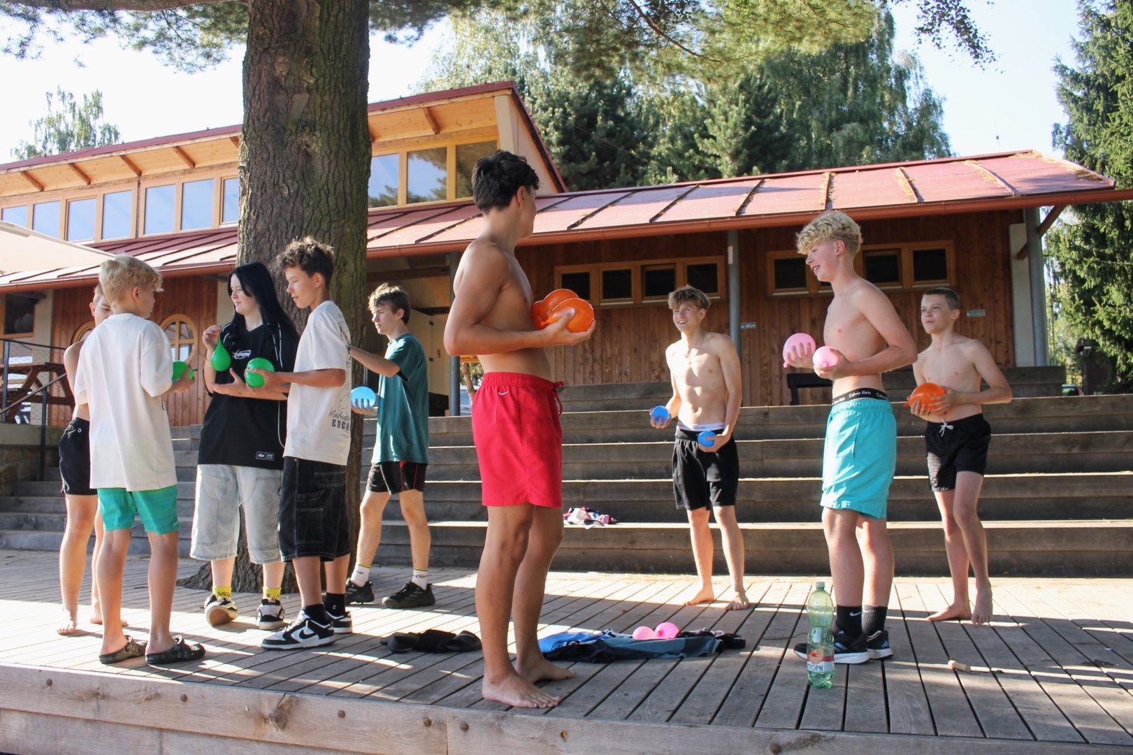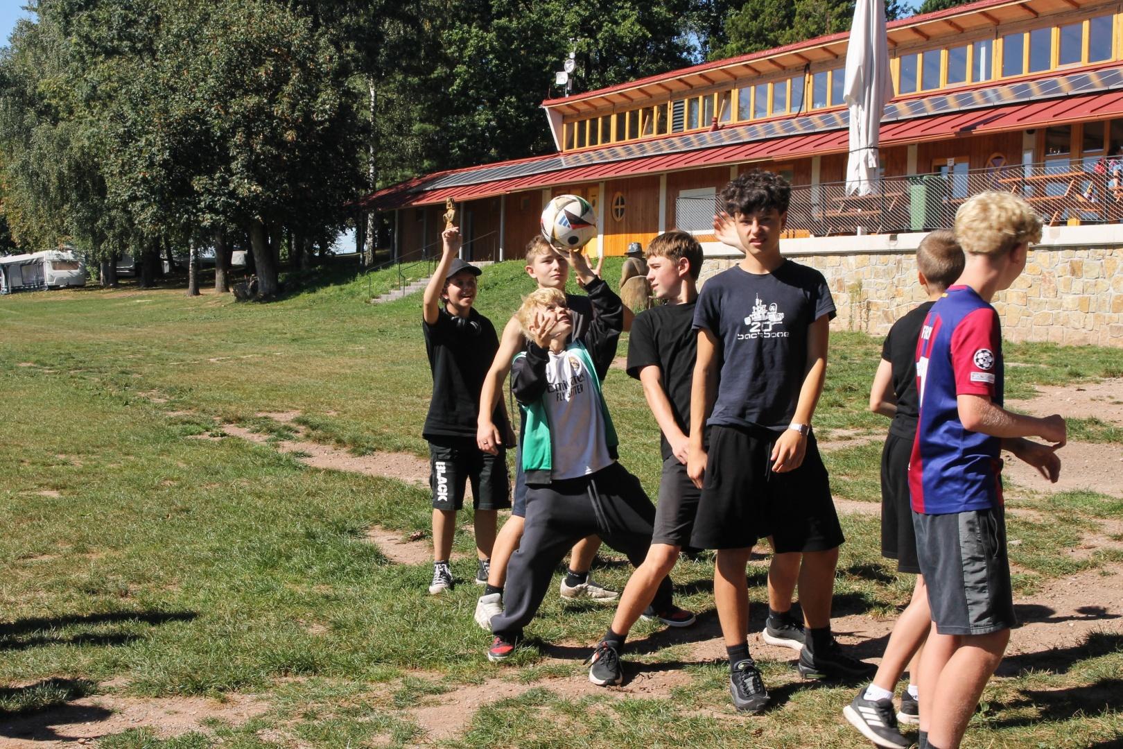 Po ubytování v chatkách na řadu přišly společné aktivity. Jednou z nich byl například sběr autogramů s otázkami k tématu prázdniny. Děti si tak měly možnost sdělit, kdo například zažil nějaký „sigma moment“, kdo se o prázdninách ztratil nebo kdo zpíval nahlas, jako by ho nikdo neslyšel, a spoustu dalšího. Poté se vyrazilo na procházku kolem Brodských rybníků. Za ty roky už jsou všichni zvyklí chodit, takže nebyly žádné protesty. Po návratu do kempu následovala balónková bitva, kde si nejprve jednotlivé týmy měly po kempu najít své náboje a pak se rozhořel vodní boj. Když už někteří byli dost mokří, rovnou skočili do rybníka a zaplavali si. Po velmi dobré večeři a chvilce osobního volna jsme se museli rozdělit na dvě party. Jedna skupina šla do lesa na dřevo, abychom si mohli rozdělat táborák. A druhá skupina šla vyprovodit spolužáka na vlak. Obě skupiny si své výlety užily. Večer se rozdělal táborák a opékaly se marshmallows. Vojta hrál na kytaru a my jsme zpívali, i když repertoár táborákových písniček budeme muset do příští společné akce ještě trochu rozšířit. Na závěr táboráku jsme odpovídali na konverzační kartičky k tématu náš poslední společný rok na ZŠ a co bychom si přáli zažít, co bychom popřáli spolužákům a další. Před spaním jsme ještě vyrazili na nedaleké pole hrát oblíbenou hru světlušky. A i když byl už čas jít spát, tak ve většině chatek probíhaly rušné hovory až do brzkých ranních hodin. Z pohledu dozoru byla noc pod širákem strávená sledováním padajících hvězd nezapomenutelným zážitkem.