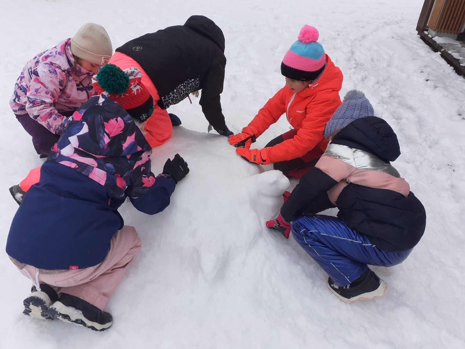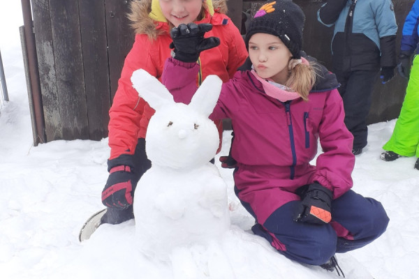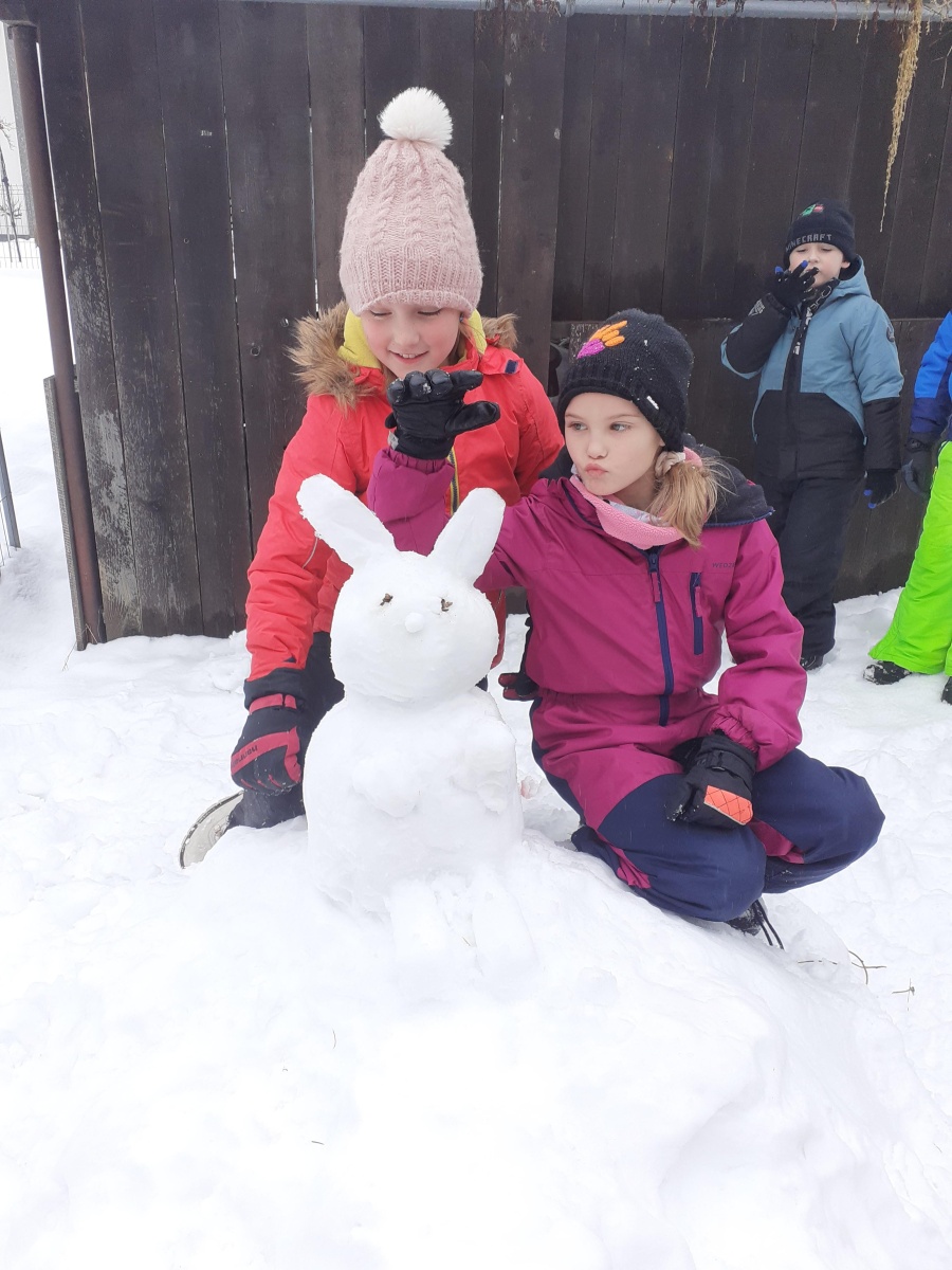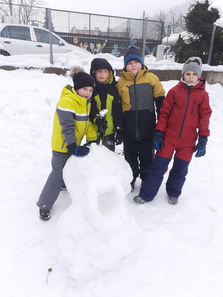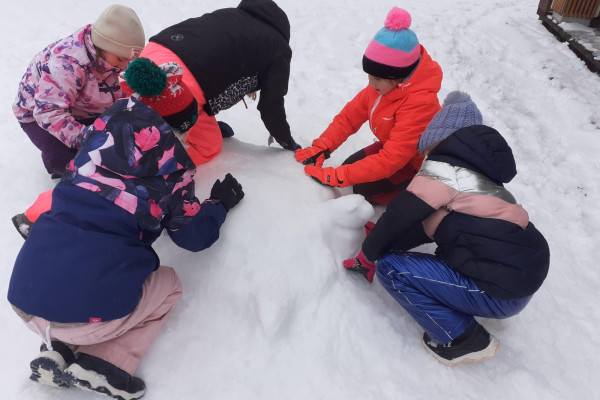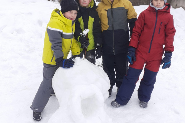 Třeťáci si užívají zimu nejen při TV na bruslích, ale také tvořením. Obleva vytvořila ideální podmínky pro stavby ze sněhu, a tak jsme vyrazili ven, abychom zkusili vytvořit i něco jiného než obvyklé sněhuláky.