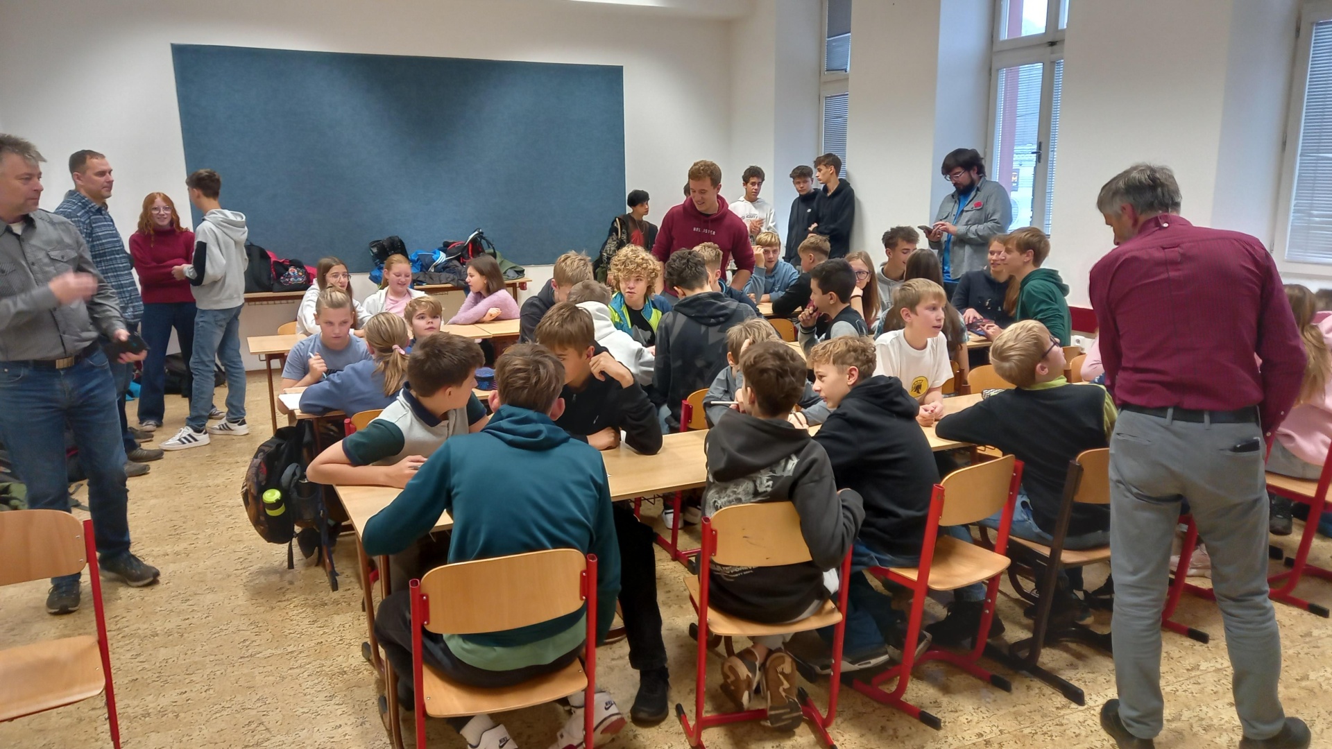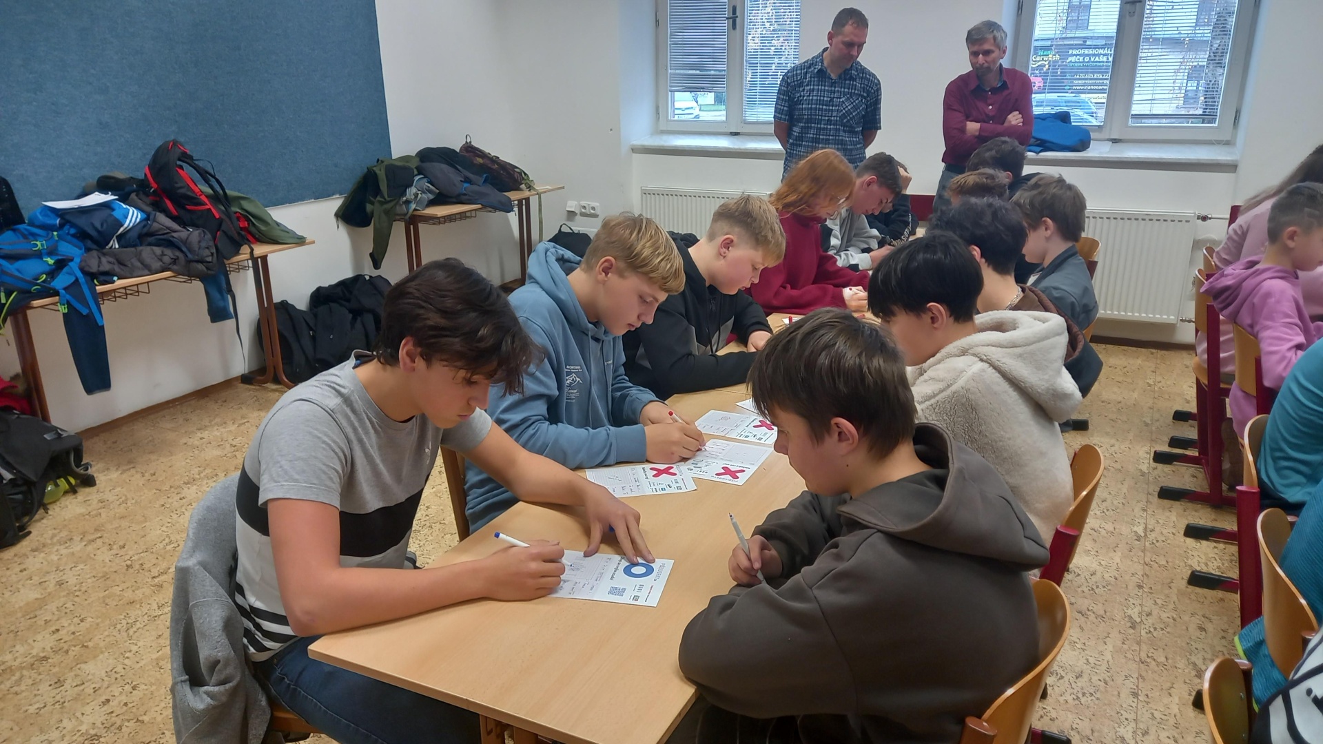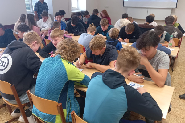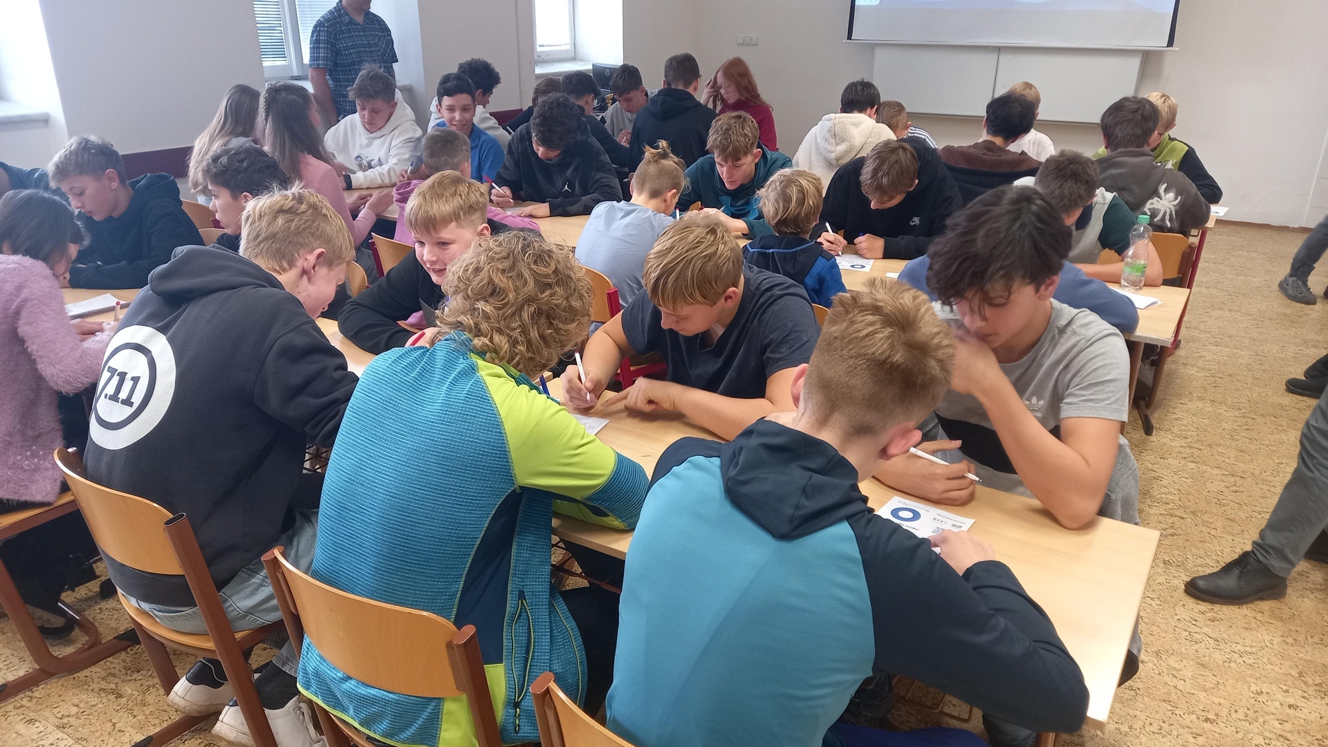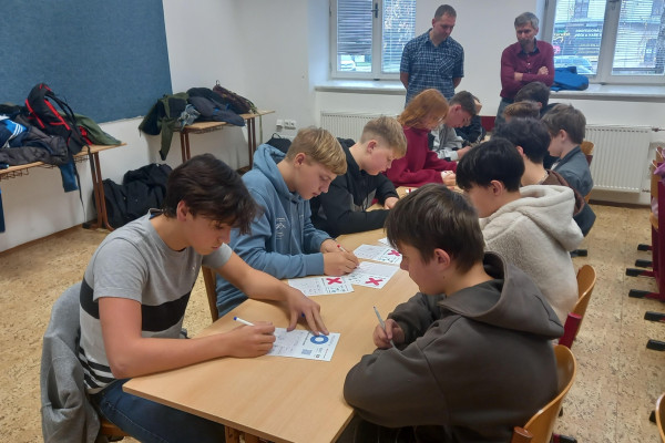 Brno (hlavní město pIšQworek) ale není jen tak, je třeba si ho zasloužit, vybojovat, všichni tak musí s křížky a s kolečky začít na oblasti. Na té naší v Trutnově se v pátek 14. listopadu potkalo z různých základních škol i z nižších gymnázií 12 tříčlenných soutěžních týmů, které pořadatelé na místě rozdělili do dvou základních skupin po šesti. Rychlými kombinatorickými výpočty to vyšlo na dvakrát patnáct základních utkání, což nadšeným účastníkům nakonec zabralo téměř celé dopoledne. Do vyřazovacích bojů pak z každé skupiny postoupily (tak nějak kolem oběda) čtyři nejlepší týmy. Naše dívky se bohužel mezi ty šťastné postupující nevešly, chlapci ale do play-off prošli. Čtvrtfinále sice bylo (těsně) nad jejich síly, v následných bojích o páté až osmé místo ale Kuba, Šimon a Matěj již zúročili nabyté zkušenosti a obě závěrečná utkání vyhráli. V nabité konkurenci tak dosáhli vynikajícího výsledku, z kterého jsme měli všichni velkou radost.