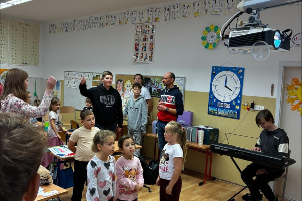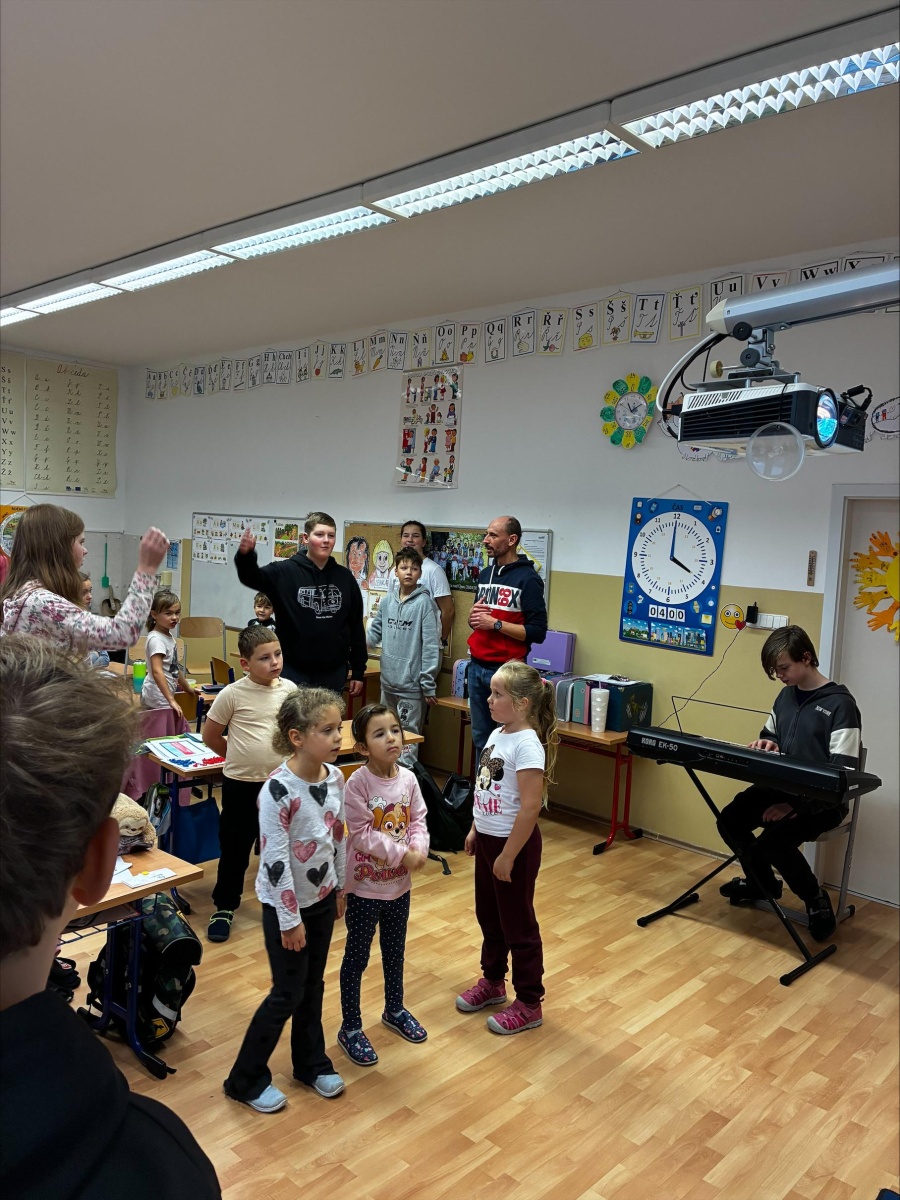 Dopoledne rychle uteklo a předposlední hodinu se děti učily státní hymnu, aby ji mohly zpívat poslední hodinu s námi. Když začala poslední hodina, tak za námi ještě přišly sedmačky (neboli kontrolorky), které na nás měly pár otázek ohledně Československa. Některé otázky prvňáci nevěděli, ale jiné zase ano. Když kontrola odešla, tak přišel čas na zazpívání té hymny. K tomu nám Šimon zahrál na piano jako doprovod. Děti zpívaly hezky. Bylo to milé a zábavné, soudíme tak i podle dotazníku, který děti na závěr vyplňovaly.