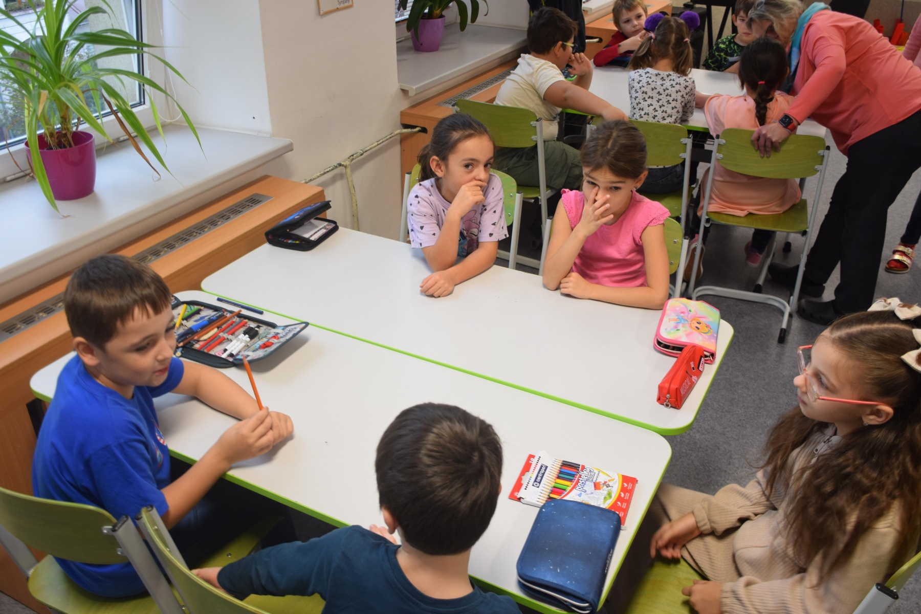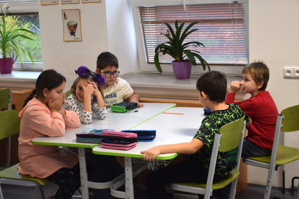 Když jsme ráno přišli do první třídy, rozdělili jsme se do skupinek. Každá skupinka měla úkoly, které měly děti zabavit na tři vyučovací hodiny (135 minut). První hodinu jsme se seznamovali s našimi parťáky a pak jsme se vrhli na práci! Někteří skládali puzzle, další vybarvovali a jiní např. ještě hráli deskovky. Někomu to trvalo déle, další to měli dříve. Někdo toho měl totiž hodně, jiný méně. Uteklo to ale rychle a byla první přestávka. Děti se nasvačily, protáhly a odpočinuly si. Koukali jsme, že děti mají o pět minut delší přestávku, aby třeba dojedly svoje svačiny. A když ji teda dojedly, vrhli jsme se opět na práci – třeba Fanda měl pro svého parťáka Zíťu připravených hodně skládaček, Terka a Klárka měly zase navlékání korálků jako trikolóru a zájemci si z nich mohli udělat buď náramek, nebo klíčenku. Dan se Šimonem měli krepový papír a z něho trhali kousky na kuličky, ze kterých lepily vlajku na papír. Byla to zkrátka spousta různých zajímavých aktivit a úkolů.