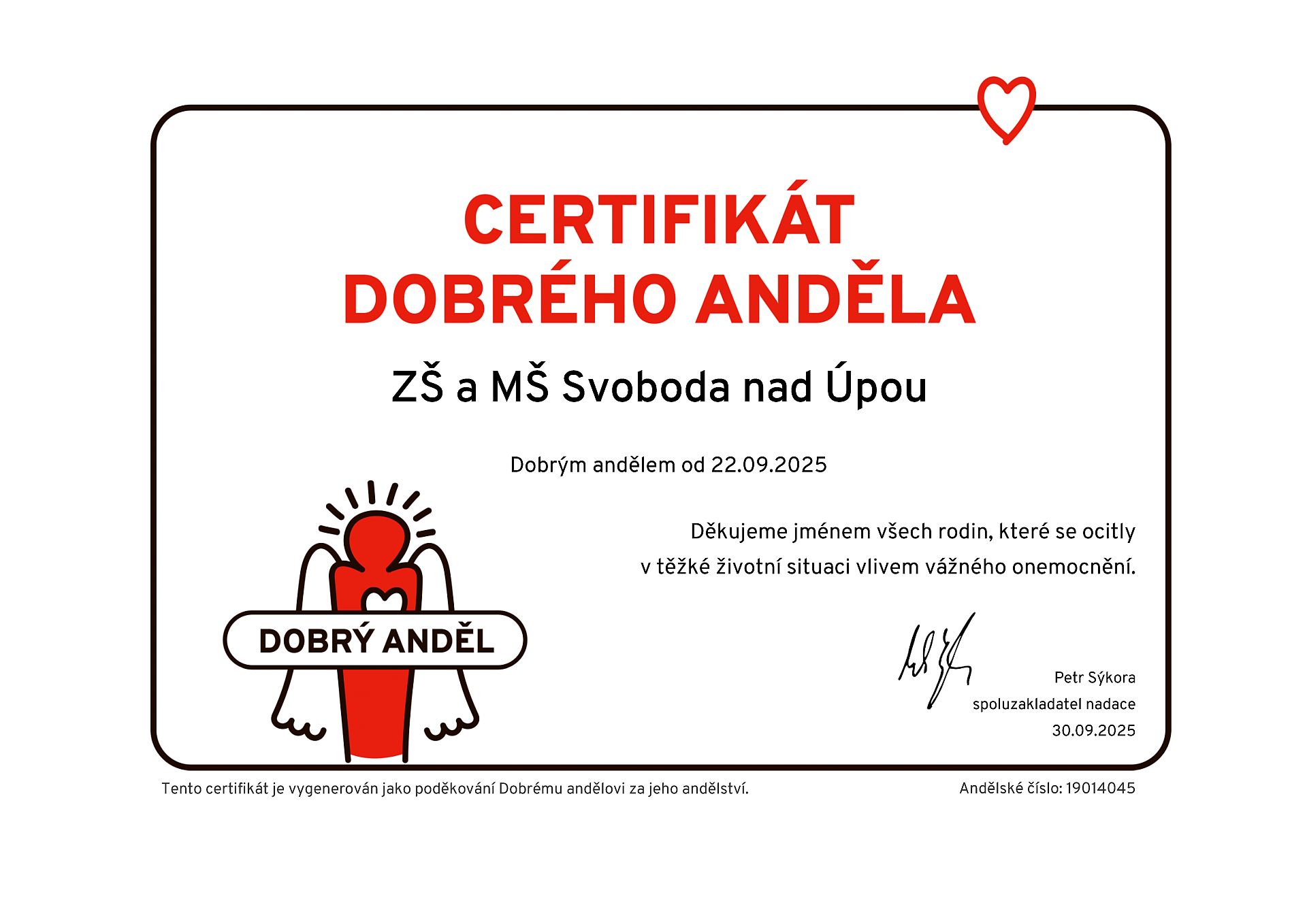 V loňském školním roce se podařilo vybrat takovou částku, že jsme z ní část věnovali prostřednictvím nadace Dobrý anděl rodinám, které se kvůli vážné nemoci ocitly v těžké životní situaci. Naše škola se tak oficiálně stala Dobrým andělem.