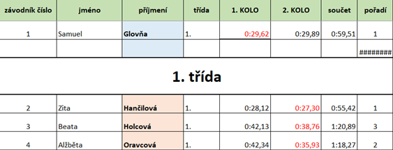 Závodníci soutěžili v několika věkových kategoriích. V kategorii prvních tříd obsadila třetí místo s časem 35,93 s Alžběta Oravcová (1.A), druhé místo Samuel Glovňa (1.A) v čase 29,62 s a vítězkou se stala Zita Hančilová (1.A) s časem 27,30 s.