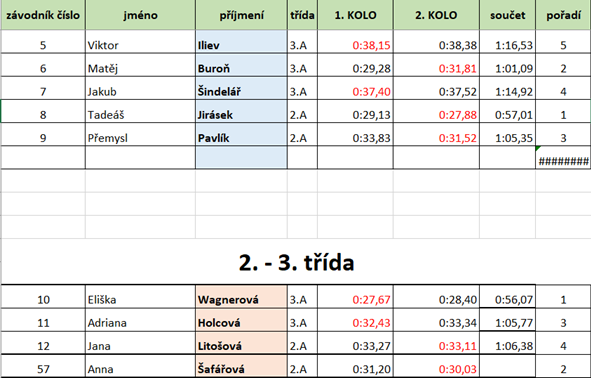 Mezi chlapci 2. a 3. tříd se na třetím místě umístil Matěj Buroň (3.A), který zajel čas 29,28 s, druhé místo vybojoval Přemysl Pavlík (2.A) s časem 31,52 s a vítězství si odnesl Tadeáš Jirásek (2.A) v čase 27,88 s.