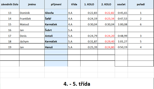 V kategorii chlapců 4. a 5. tříd se třetí umístil Denis Antoň (5.A) v čase 24,20 s, druhý byl František Šafář (4.A) v čase 23,34 s a vítězem se stal Dominik Glovňa (4.A) s časem 22,82 s.