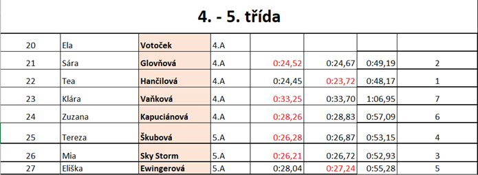 Mezi dívkami 4. a 5. tříd obsadila třetí místo Mia Storm Sky (5.A) v čase 26,21 s, druhé Sára Glovňová (4.A) – čas 24,52 s a vítězkou se stala Tea Hančilová (4.A) v čase 23,72 s.