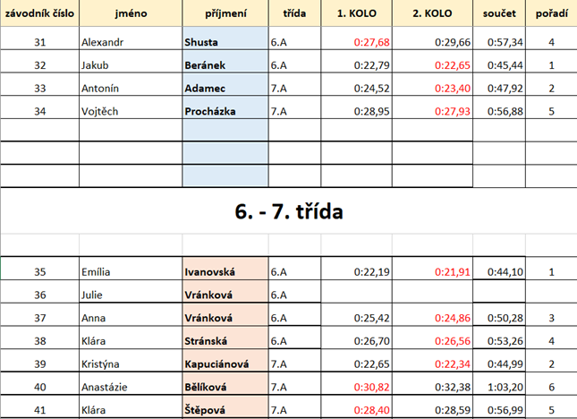V kategorii chlapců 6. a 7. tříd vybojoval třetí místo Michael Škarda (6.A) v čase 26,73 s, druhý skončil Antonín Adamec (7.A) s časem 23,40 s a vítězství si připsal Jakub Beránek (6.A), který zajel čas 22,65 s.