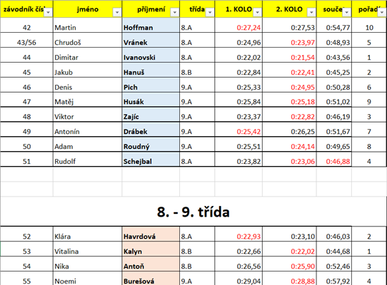 Velmi napínavé byly také závody 8. a 9. tříd. Mezi chlapci obsadil třetí místo Viktor Zajíc (9.A) v čase 22,82 s, druhý skončil Jakub Hanuš (8.B) s časem 22,41 s, a vítězem se stal Dimitar Ivanovski (8.A), který navíc zajel nejrychlejší čas celého dne – 21,54 s.