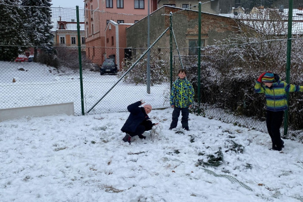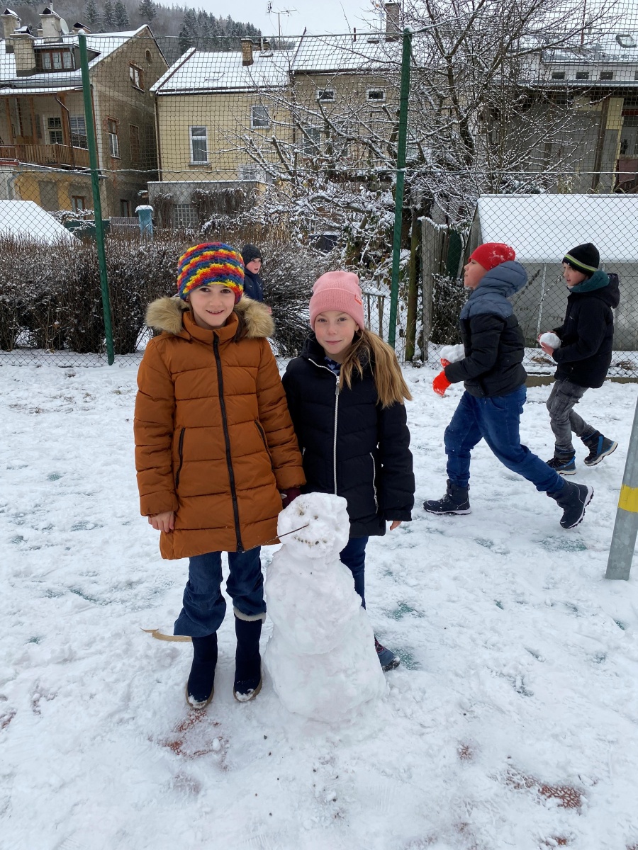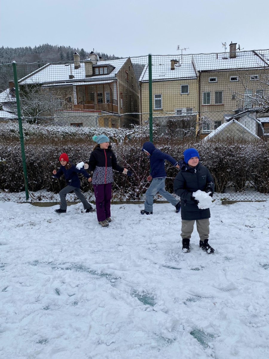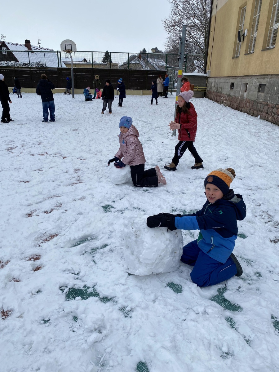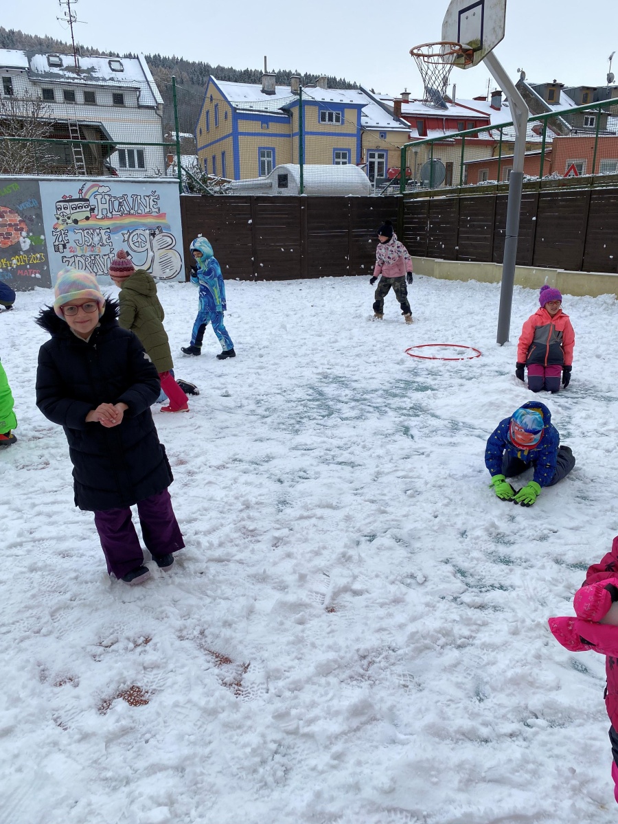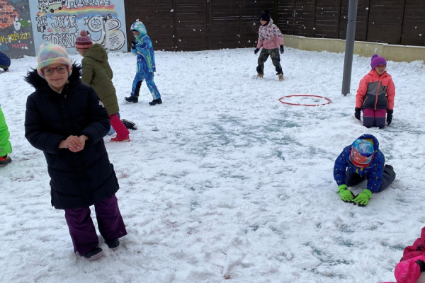 Pokud napadne sníh, tak velká přestávka na školním hřišti je jasnou volbou. Po návratu do třídy jsme sice promrzlí, ale nadmíru spokojení.