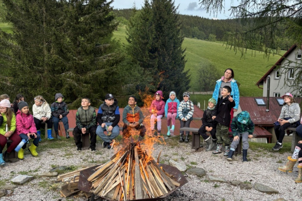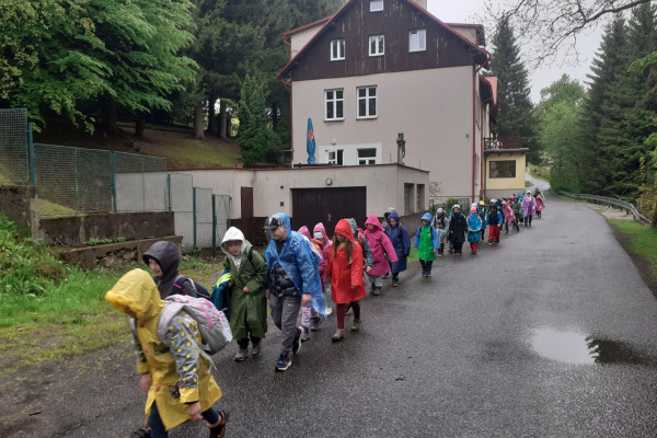 Ve středu 28. května 2025 jsme šli pěšky do Albeřic. Na cestu nám stačil jen batůžek, ostatní věci nám dovezl až na chatu Dům setkání YMCA pan Vítek. Pozorovali jsme zajímavou přírodu, např. mladého ptáčka spadlého na zemi. Ubytovali jsme se na pokojích a vybalili si věci, k obědu byla rajská s těstovinami. Odpoledne po poledním klidu jsme si hráli venku (fotbal, švihadlovou školku, badminton, luštili tajenku). Večer jsme hráli společenské hry a nechyběla ani pohádka na dobrou noc.